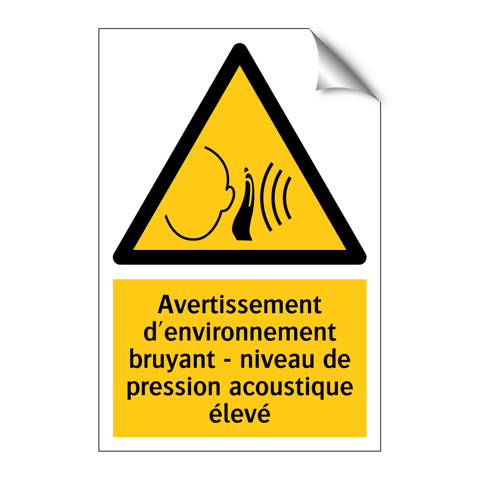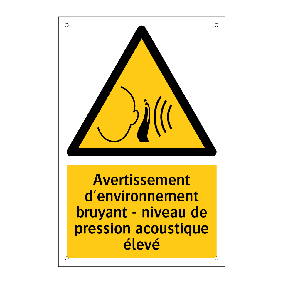 Panneau d'avertissement avec le texte : "Avertissement d'environnement bruyant - niveau de pression acoustique élevé"