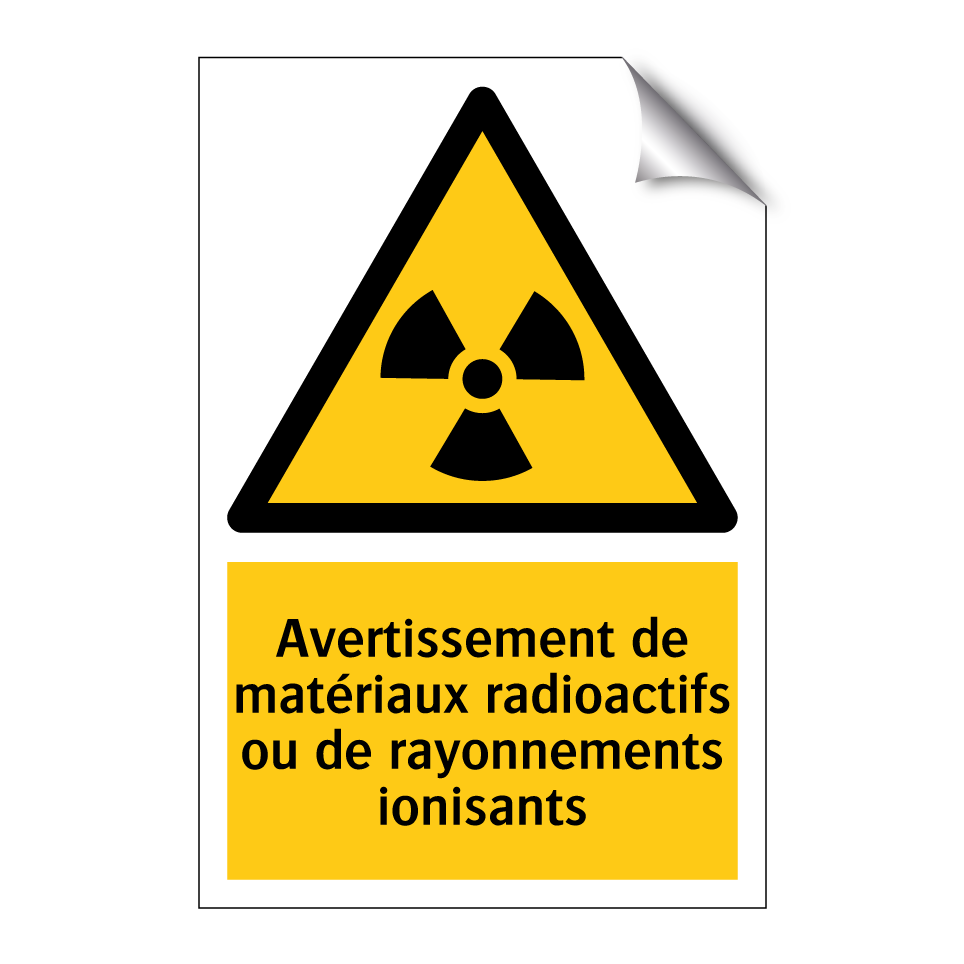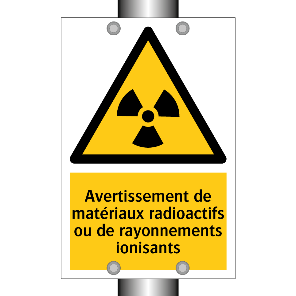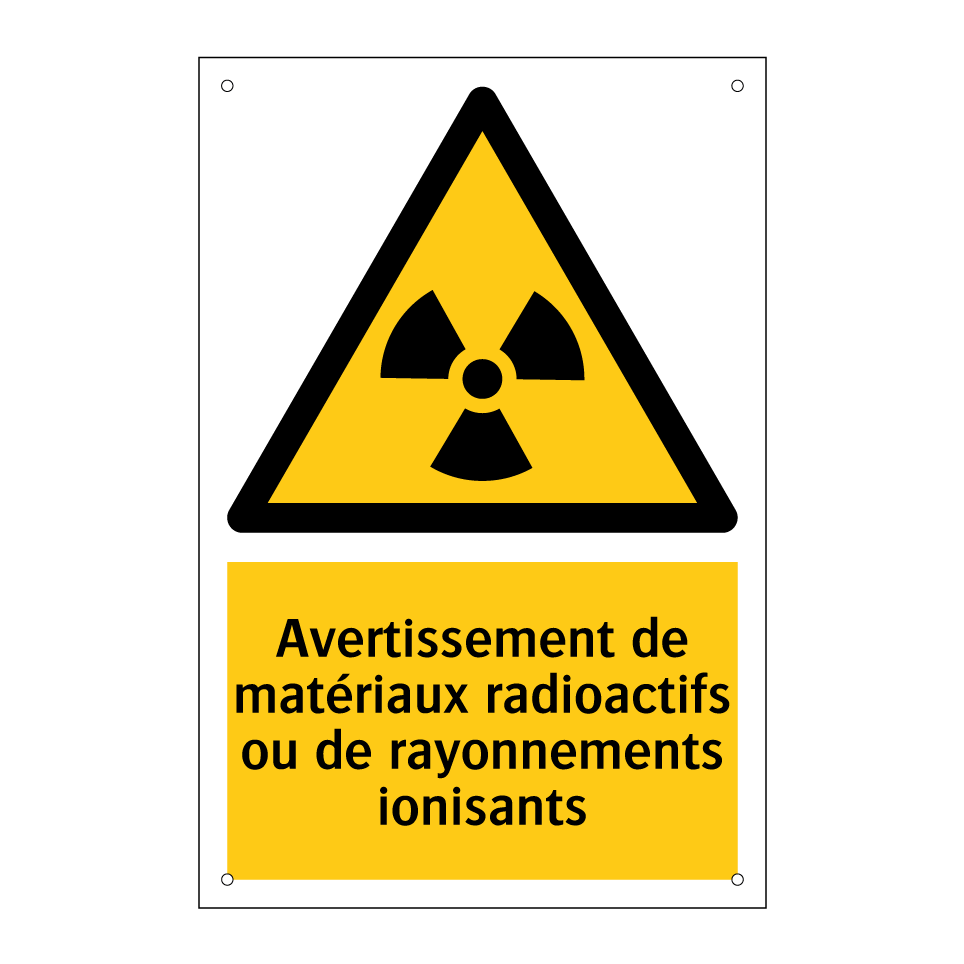 Panneau d'avertissement avec le texte : "Avertissement de matériaux radioactifs ou de rayonnements ionisants"