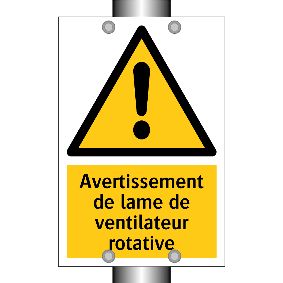 Panneau d'avertissement avec le texte : "Avertissement de lame de ventilateur rotative"