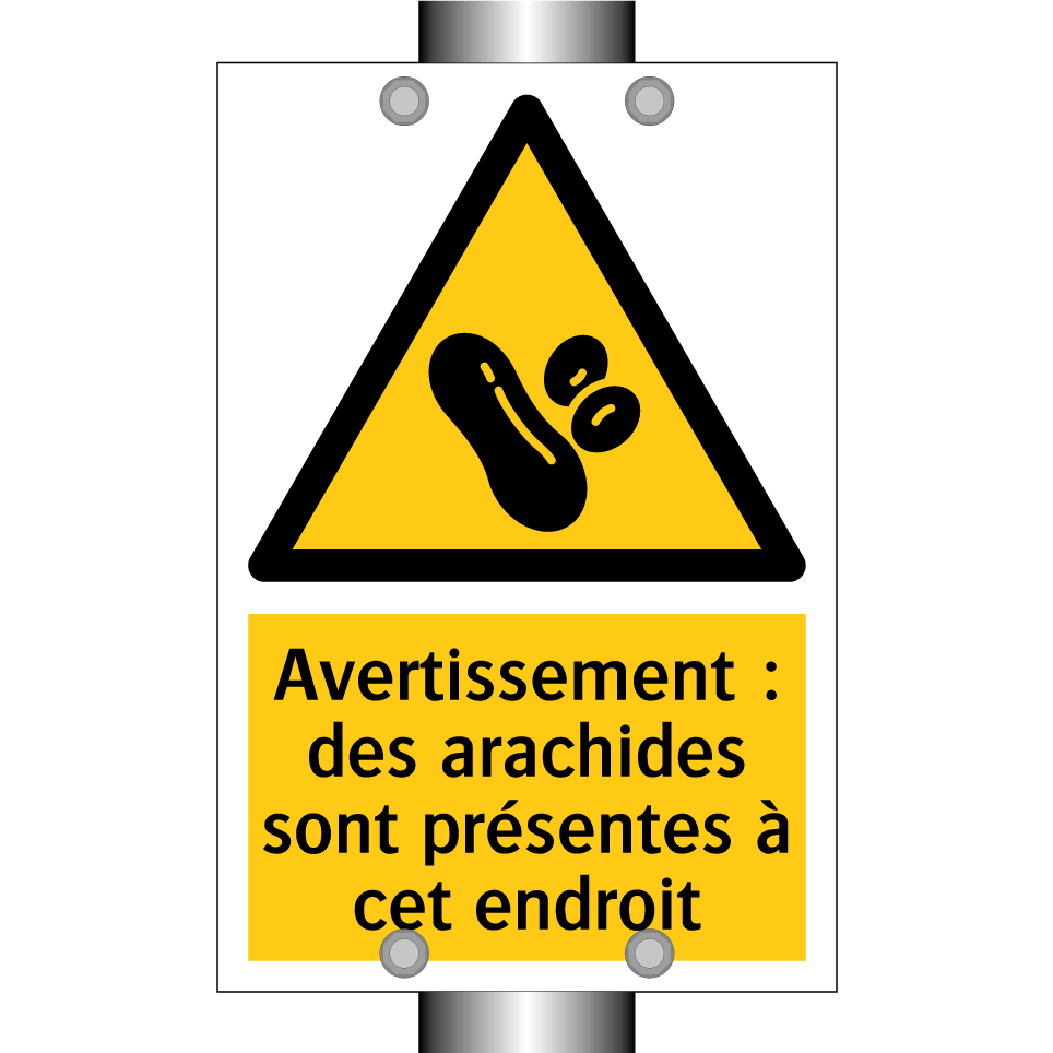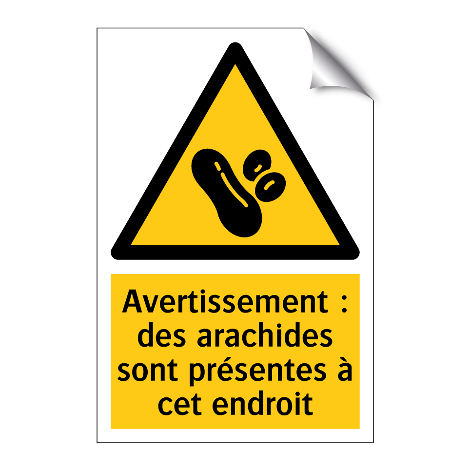 Panneau d'avertissement avec le texte : "Avertissement : des arachides sont présentes à cet endroit"