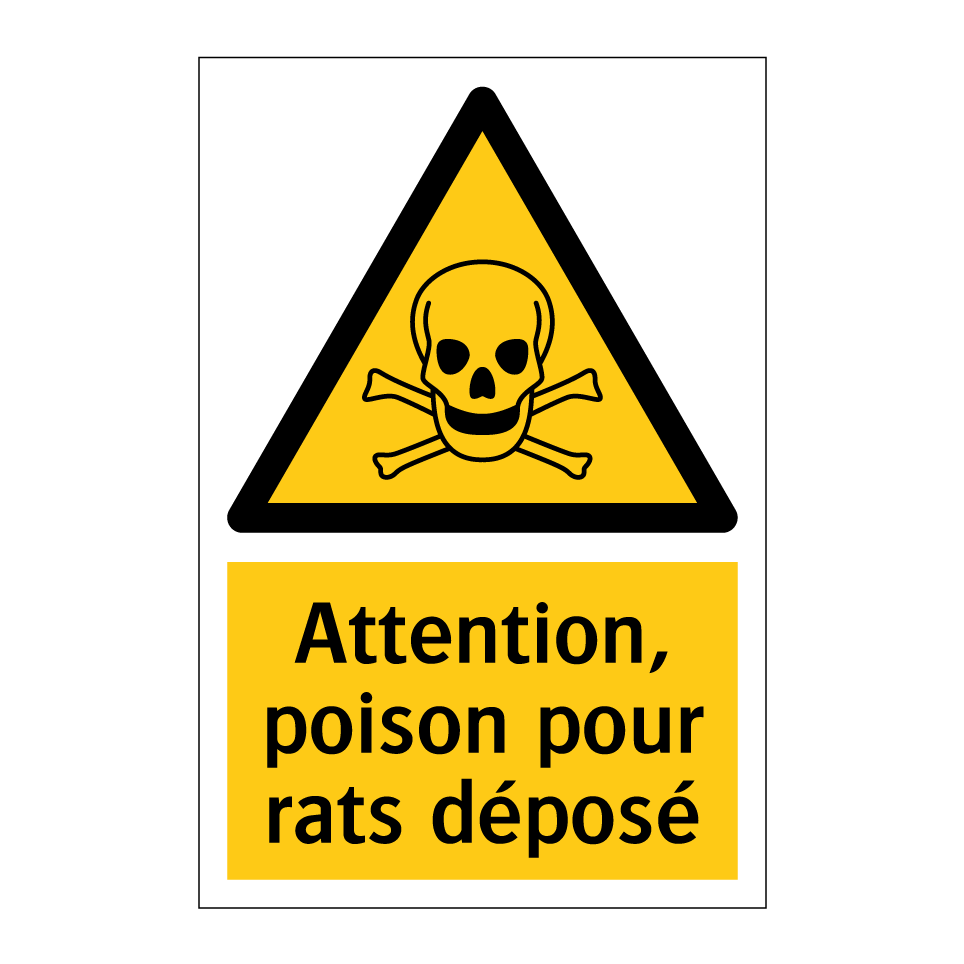 Panneau d'avertissement avec le texte : "Attention, poison pour rats déposé"
