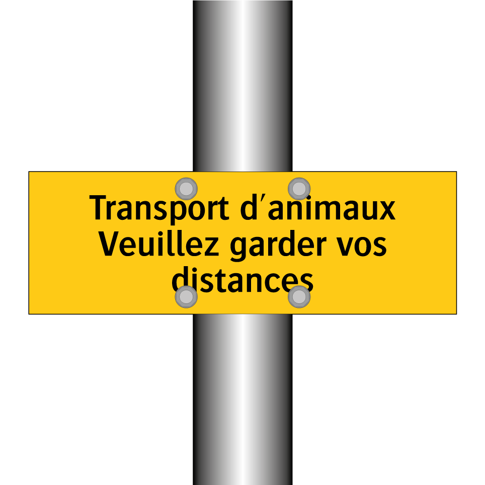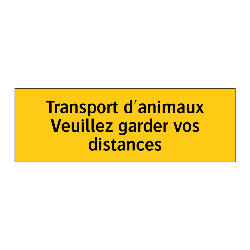 Panneau d'avertissement avec le texte : "Transport d'animaux Veuillez garder vos distances"
