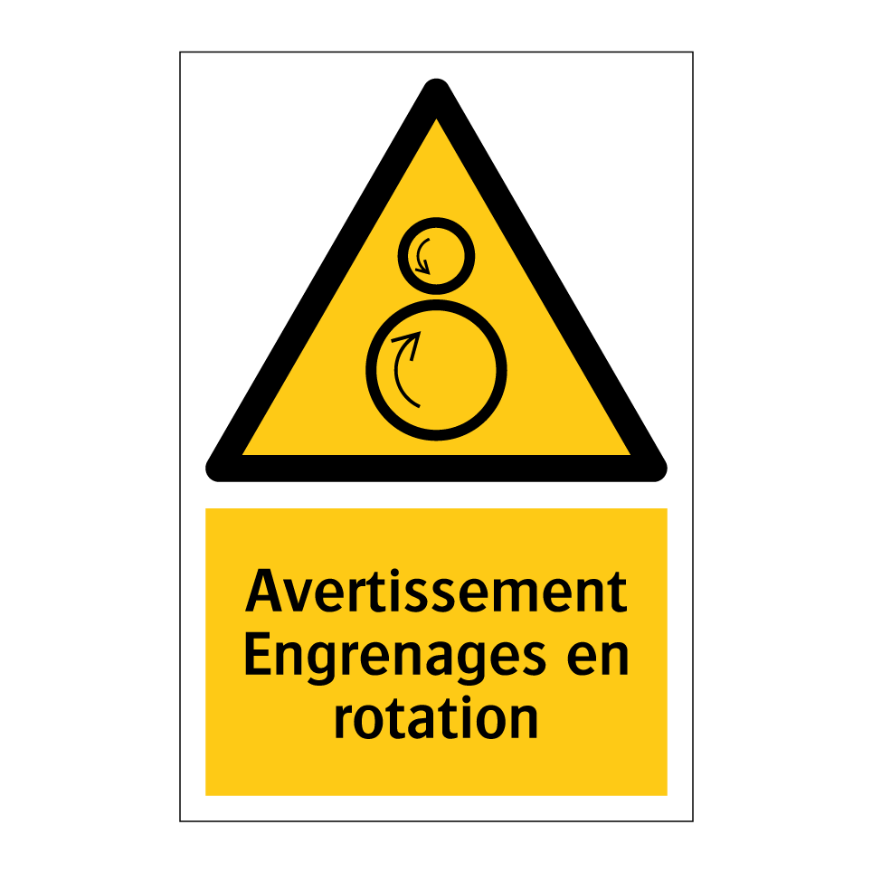 Panneau d'avertissement avec le texte : "Avertissement Engrenages en rotation"