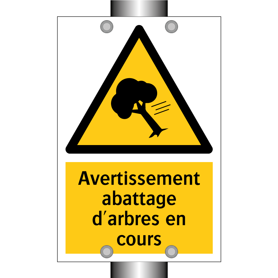 Panneau d'avertissement avec le texte : "Avertissement abattage d'arbres en cours"