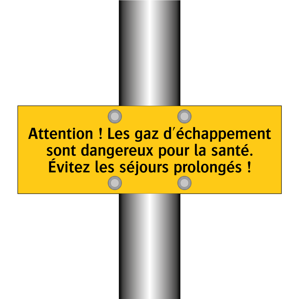 Panneau d'avertissement avec le texte : "Attention ! Les gaz d'échappement sont dangereux pour la santé. Évitez les séjours prolongés !"