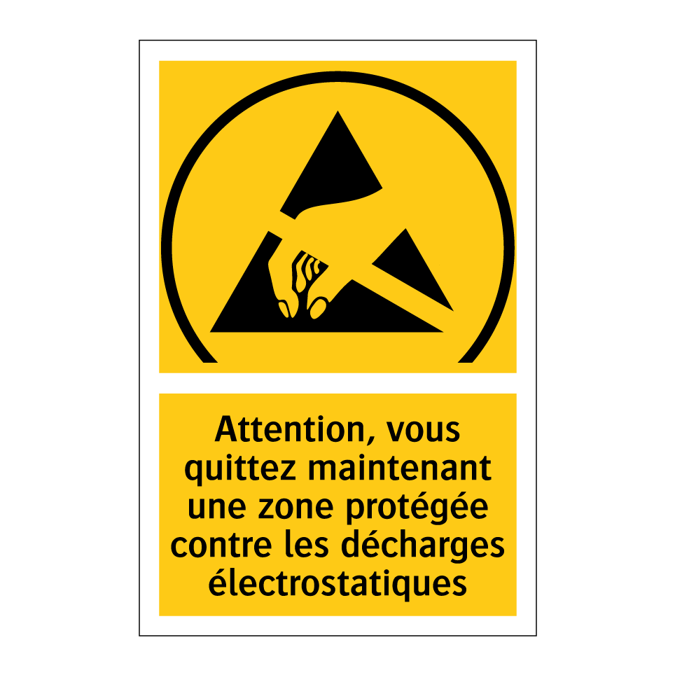 Panneau d'avertissement avec le texte : "Attention, vous quittez maintenant une zone protégée contre les décharges électrostatiques"