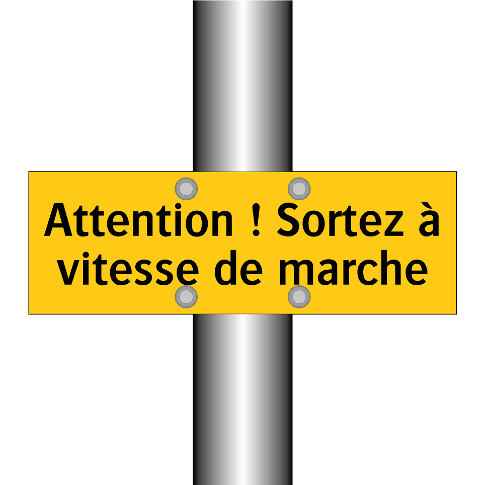 Panneau d'avertissement avec le texte : "Attention ! Sortez à vitesse de marche"