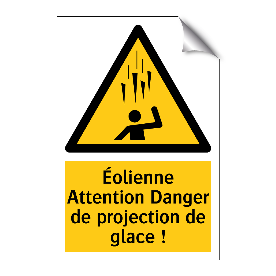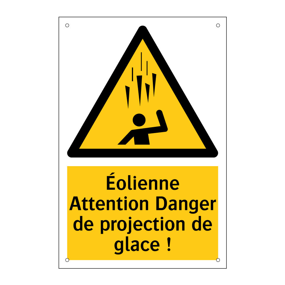 Panneau d'avertissement avec le texte : "Éolienne Attention Danger de projection de glace !"