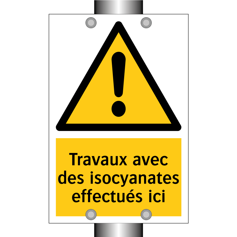 Panneau d'avertissement avec le texte : "Travaux avec des isocyanates effectués ici"