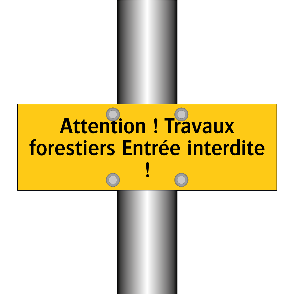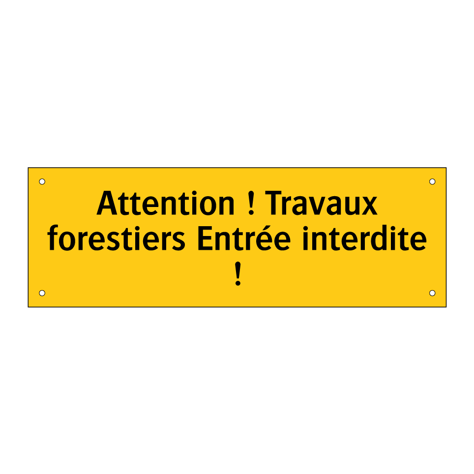 Ce panneau d'avertissement est essentiel pour garantir la sécurité dans les zones forestières où des travaux sont en cours. Il est conçu pour informer et alerter les passants des dangers potentiels liés aux activités forestières. Ce panneau est idéal pour être placé à l'entrée des chantiers forestiers, des sentiers ou des chemins menant à des zones de coupe de bois. En signalant clairement l'interdiction d'accès, il contribue à prévenir les accidents et à protéger les personnes non autorisées. Sa couleur jaune vive et son texte noir assurent une visibilité optimale, même de loin, attirant immédiatement l'attention des promeneurs et des travailleurs.