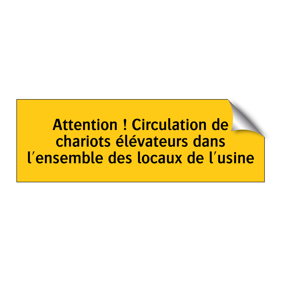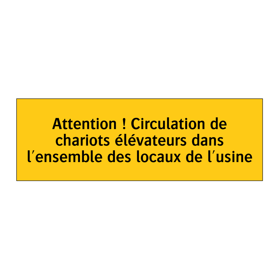 Panneau d'avertissement avec le texte : "Attention ! Circulation de chariots élévateurs dans l'ensemble des locaux de l'usine"