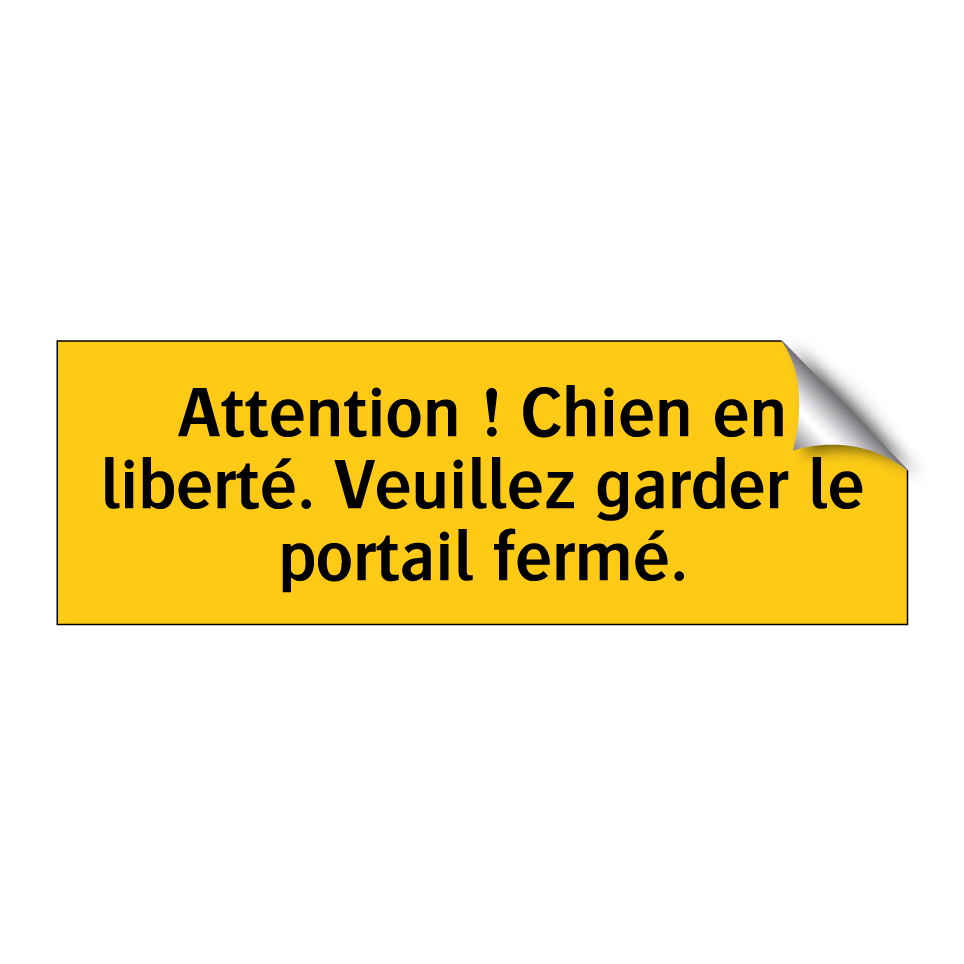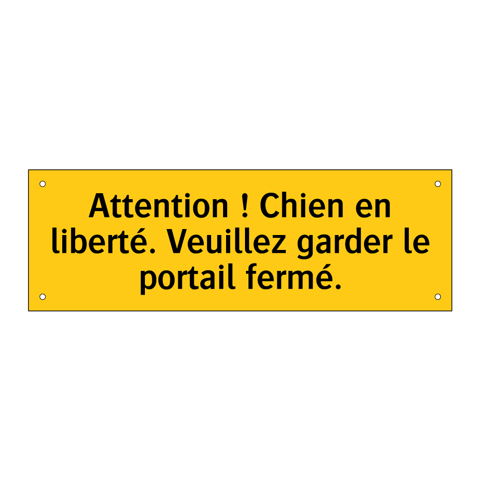 Panneau d'avertissement avec le texte : "Attention ! Chien en liberté. Veuillez garder le portail fermé"
