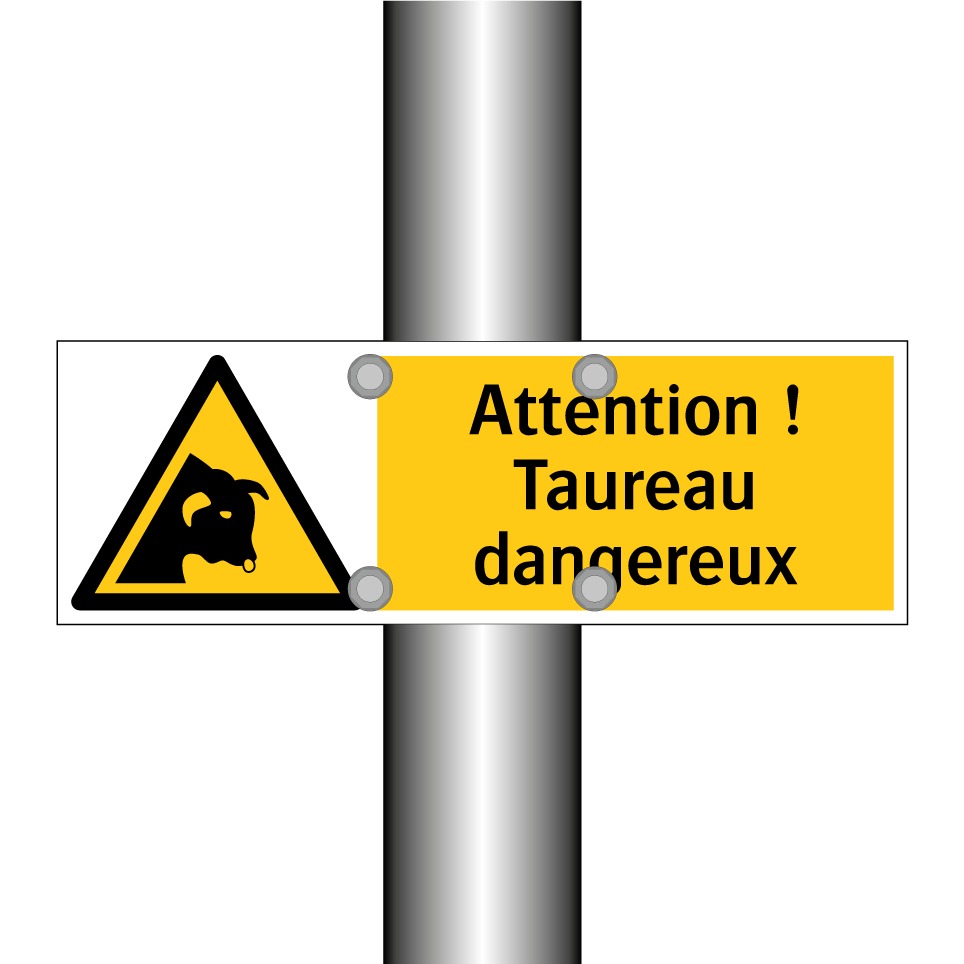 Panneau d'avertissement avec le texte : "Attention ! Taureau dangereux"