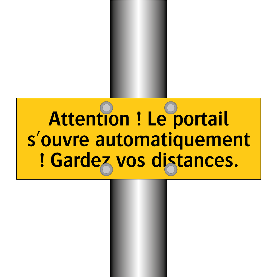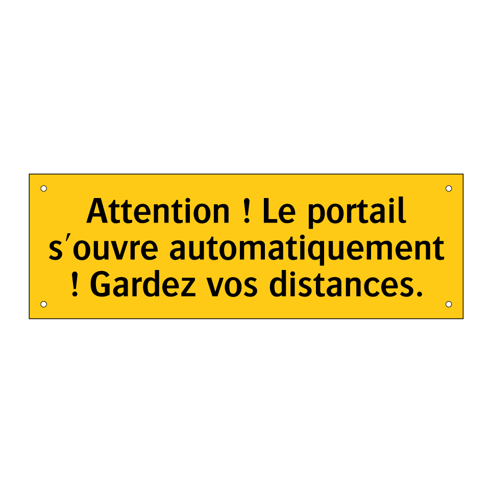 Panneau d'avertissement avec le texte : "Attention ! Le portail s'ouvre automatiquement ! Gardez vos distances"