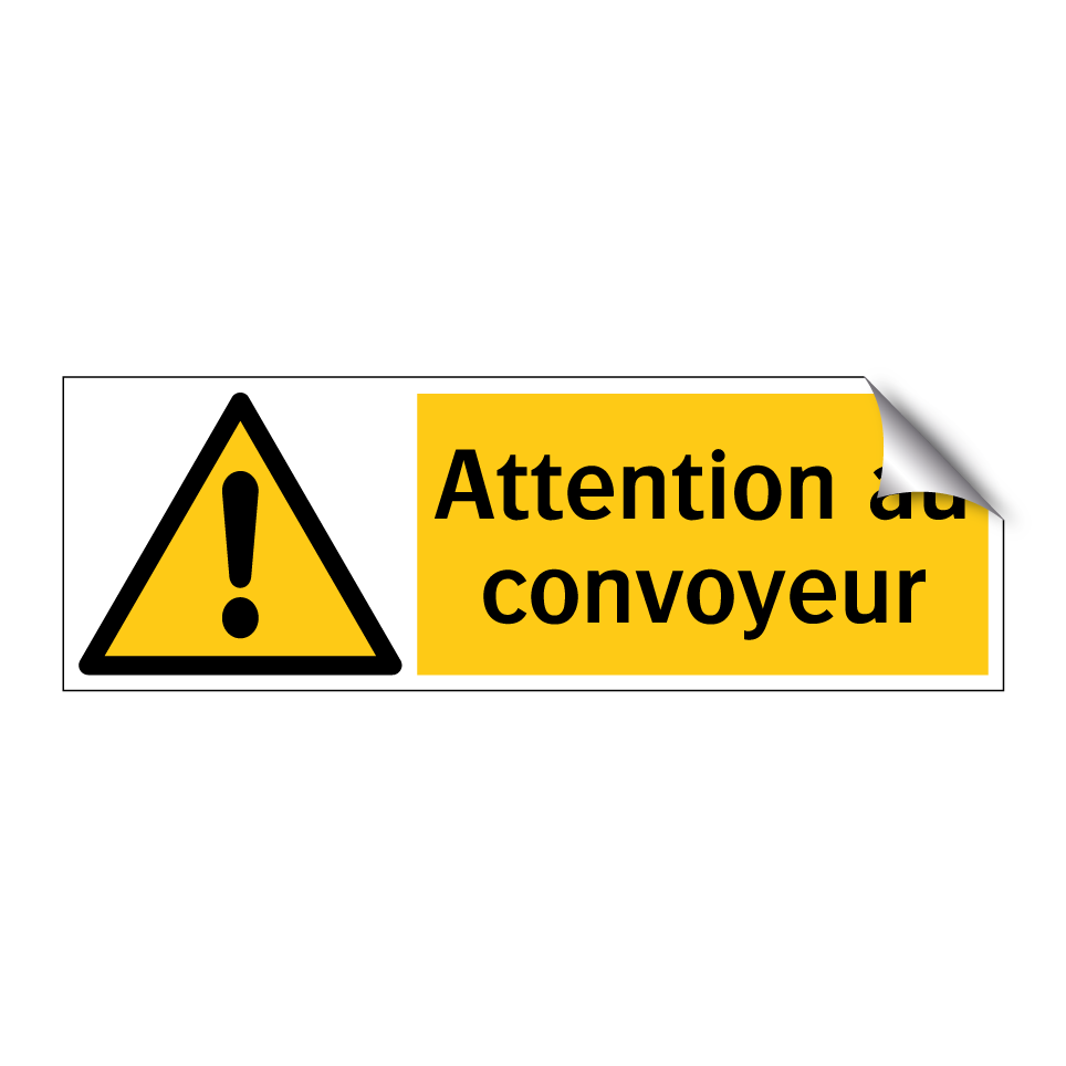 Panneau d'avertissement avec le texte : "Attention au convoyeur"