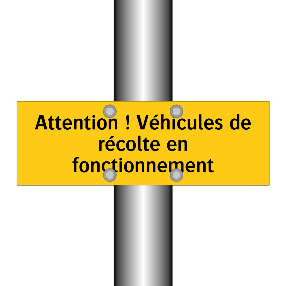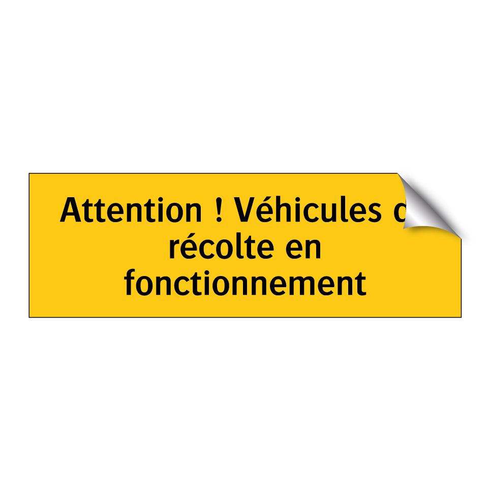 Panneau d'avertissement avec le texte : "Attention ! Véhicules de récolte en fonctionnement"