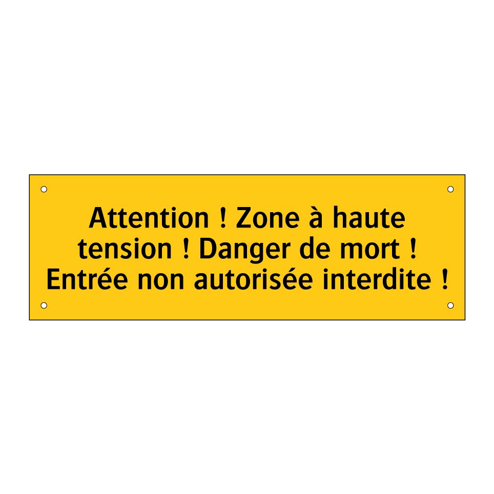 Panneau d'avertissement avec le texte : "Attention ! Zone à haute tension ! Danger de mort ! Entrée non autorisée interdite !"