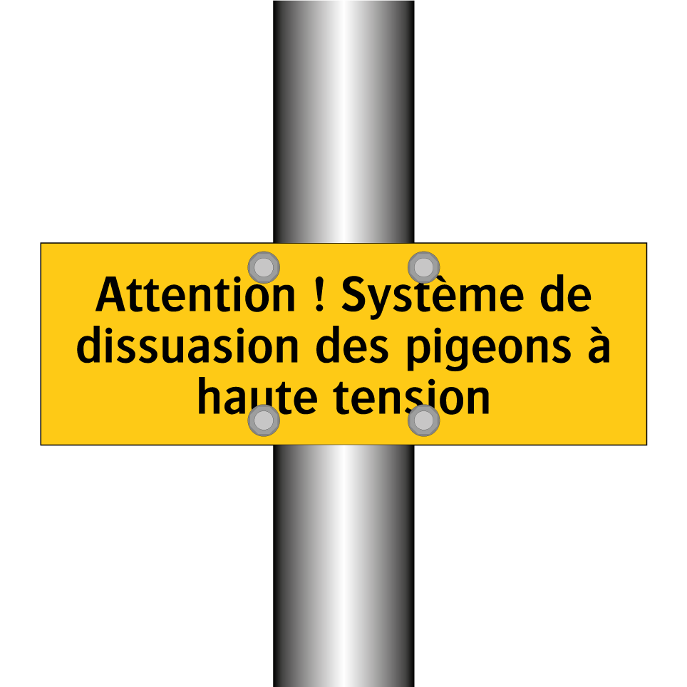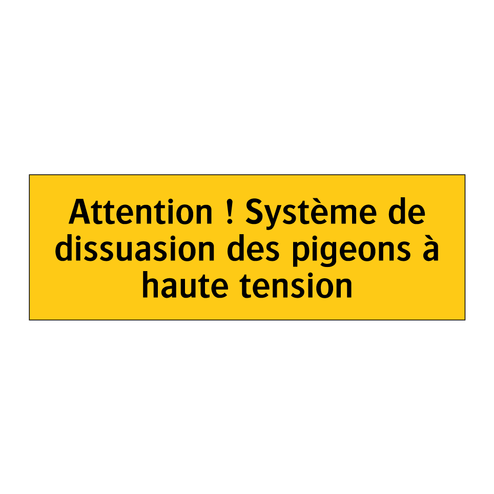 Panneau d'avertissement avec le texte : "Attention ! Système de dissuasion des pigeons à haute tension"