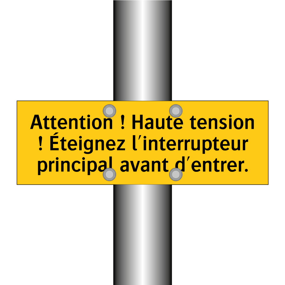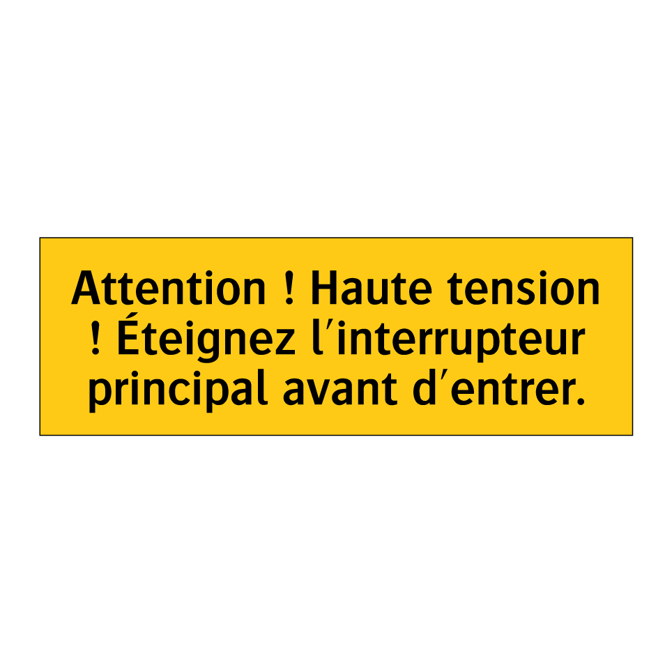 Panneau d'avertissement avec le texte : "Attention ! Haute tension ! Éteignez l'interrupteur principal avant d'entrer"