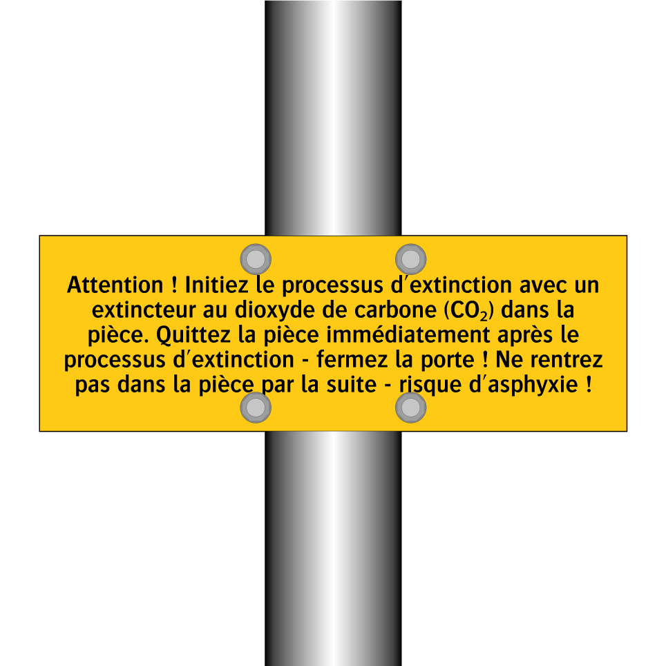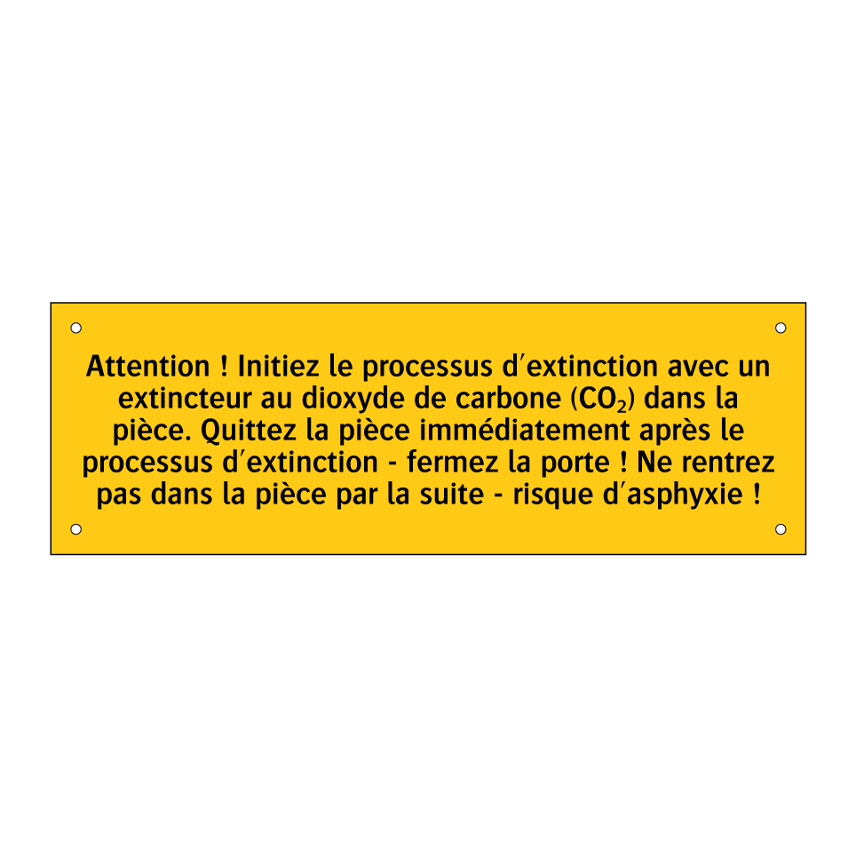 Panneau d'avertissement avec le texte : "Attention ! Initiez le processus d'extinction avec un extincteur au dioxyde de carbone (CO₂) dans la pièce. Quittez la pièce immédiatement après le processus d'extinction - fermez la porte ! Ne rentrez pas dans la pièce par la suite - risque d'asphyxie !"