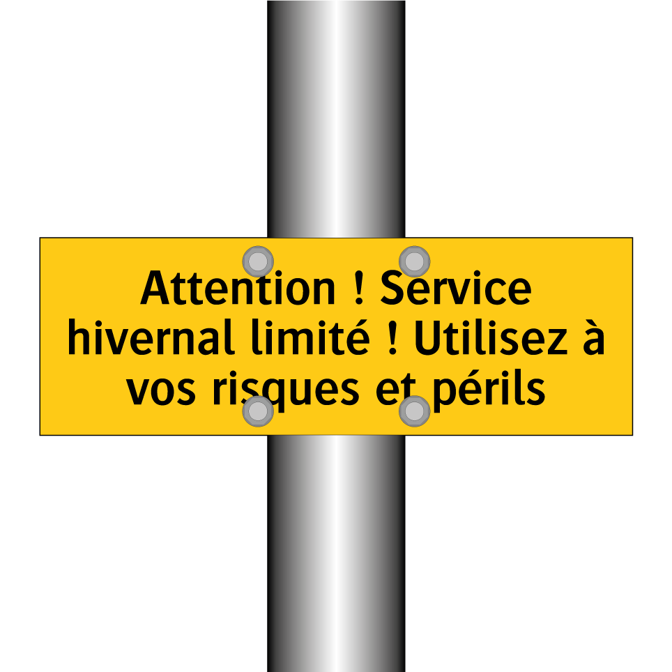 Panneau d'avertissement avec le texte : "Attention ! Service hivernal limité ! Utilisez à vos risques et périls"