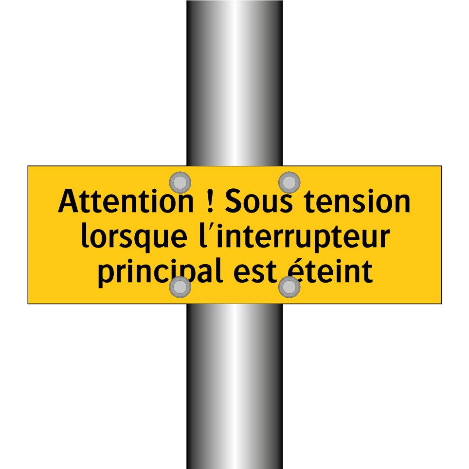 Panneau d'avertissement avec le texte : "Attention ! Sous tension lorsque l'interrupteur principal est éteint"