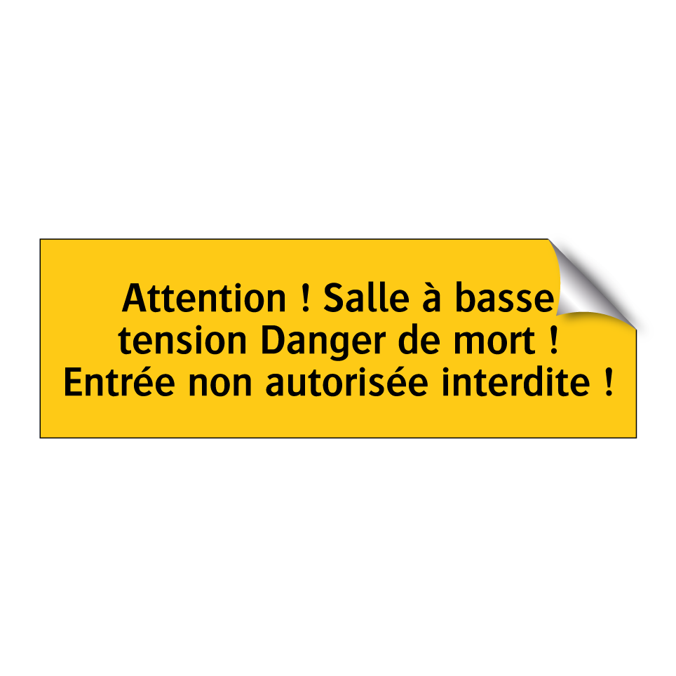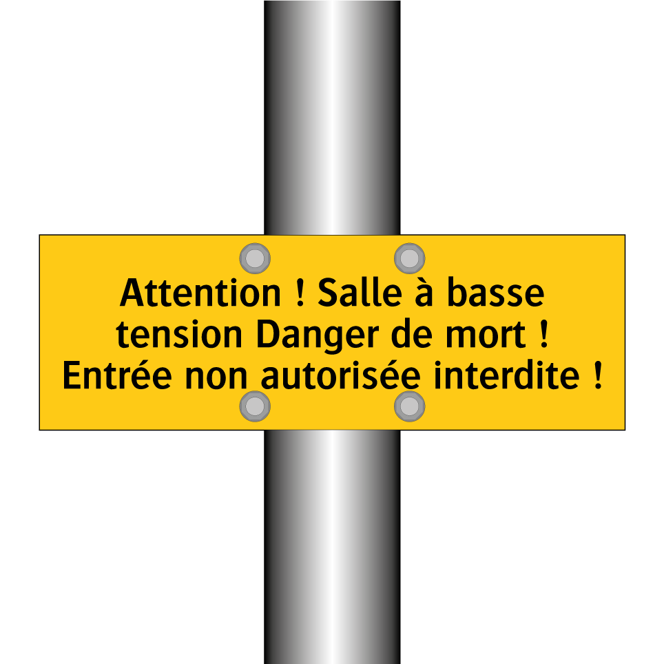 Panneau d'avertissement avec le texte : "Attention ! Salle à basse tension Danger de mort ! Entrée non autorisée interdite !"