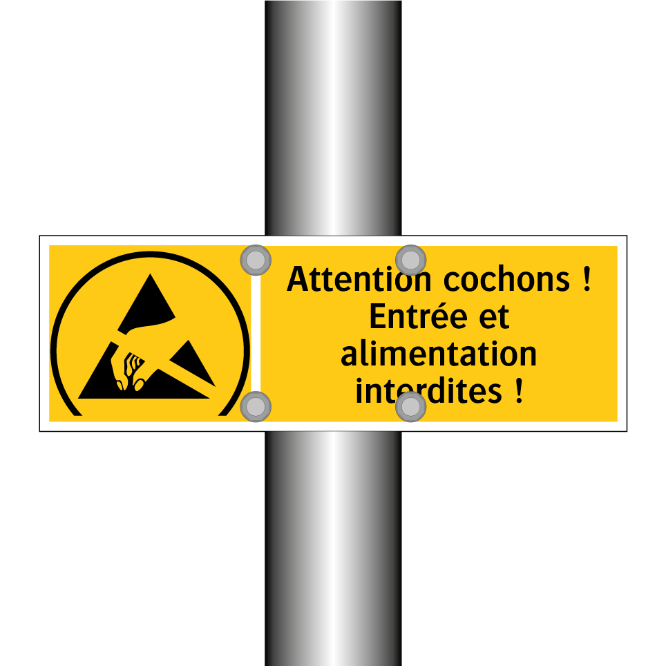 Panneau d'avertissement avec le texte : "Attention cochons ! Entrée et alimentation interdites !"