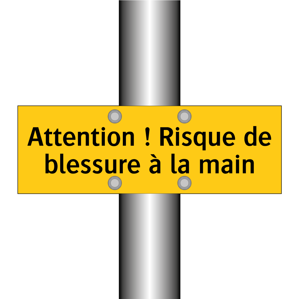 Panneau d'avertissement avec le texte : "Attention ! Risque de blessure à la main"