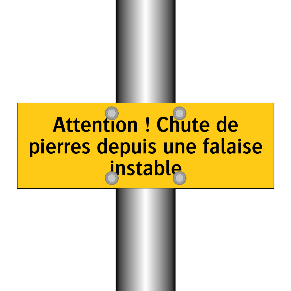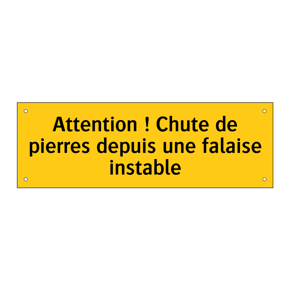 Ce panneau d'avertissement est essentiel pour garantir la sécurité dans les zones sujettes aux chutes de pierres. Idéal pour être placé à proximité de falaises instables, il alerte les passants du danger potentiel de débris rocheux. Ce type de signalisation est crucial dans les environnements montagneux ou sur les routes sinueuses où le risque de glissements de terrain est élevé. En installant ce panneau, vous contribuez à prévenir les accidents et à protéger les piétons et les conducteurs. Sa visibilité élevée grâce à sa couleur jaune et son texte noir assure une reconnaissance immédiate du danger.