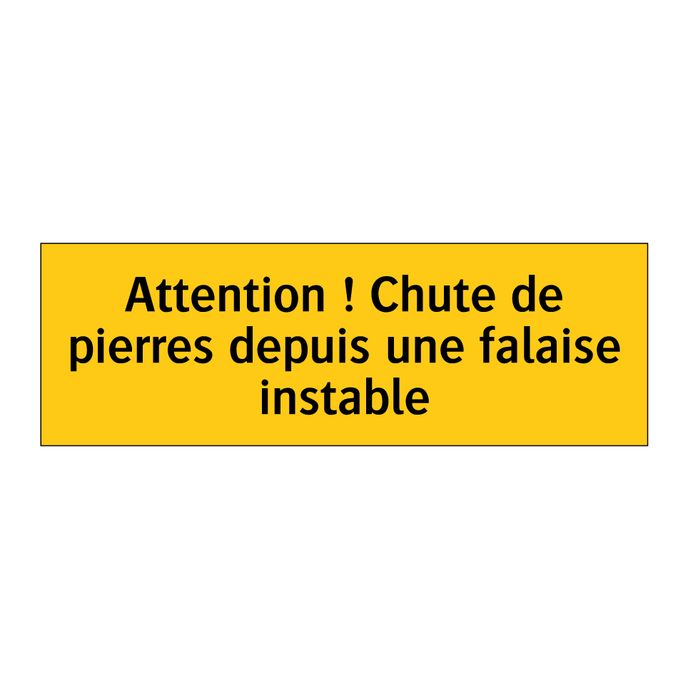 Panneau d'avertissement avec le texte : "Attention ! Chute de pierres depuis une falaise instable"