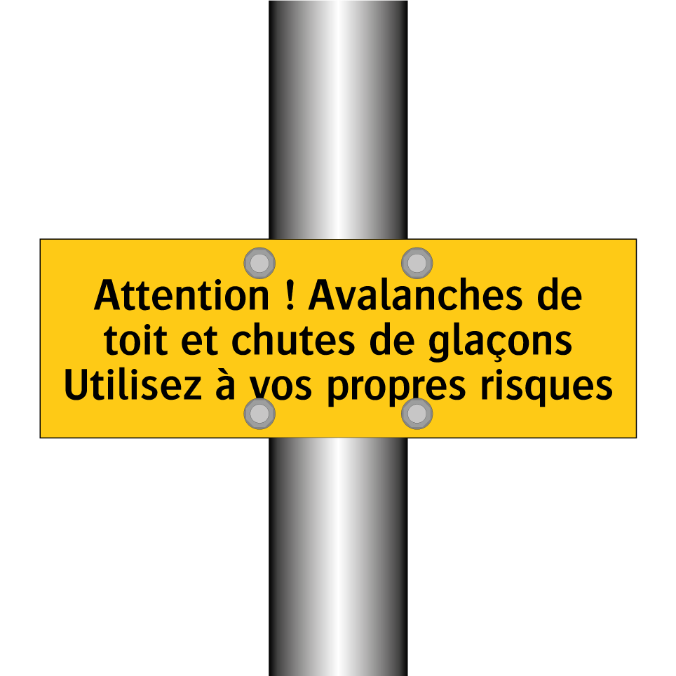 Panneau d'avertissement avec le texte : "Attention ! Avalanches de toit et chutes de glaçons Utilisez à vos propres risques"