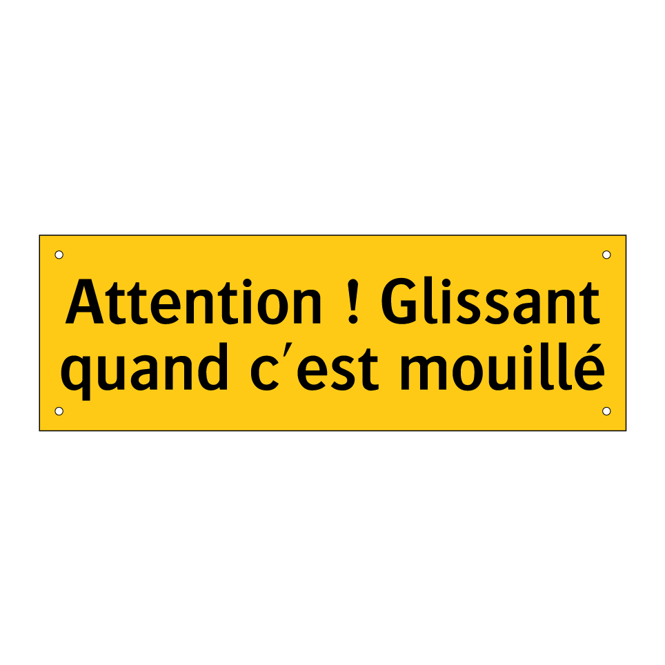 Panneau d'avertissement avec le texte : "Attention ! Glissant quand c'est mouillé"