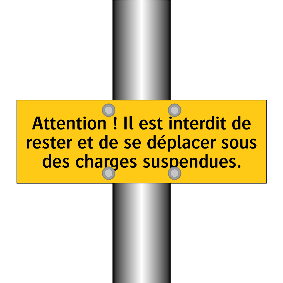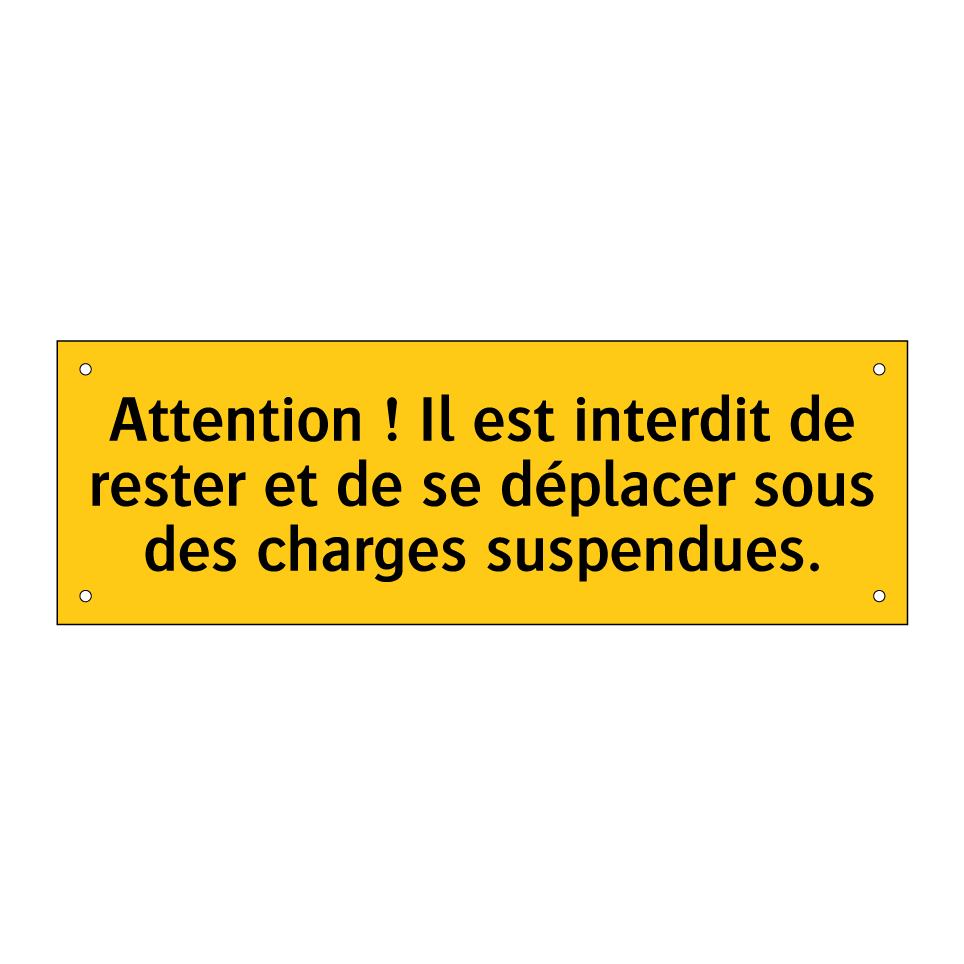 Panneau d'avertissement avec le texte : "Attention ! Il est interdit de rester et de se déplacer sous des charges suspendues"