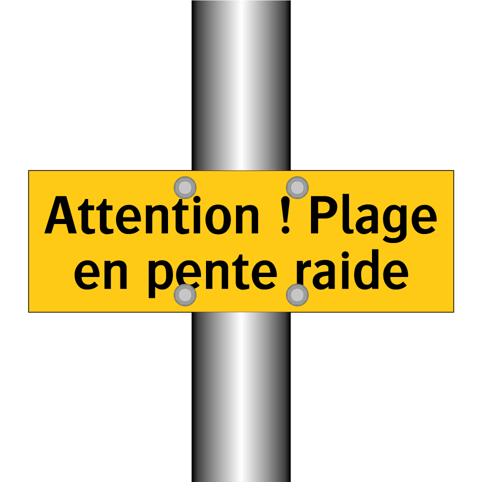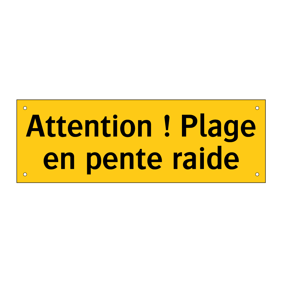Panneau d'avertissement avec le texte : "Attention ! Plage en pente raide"