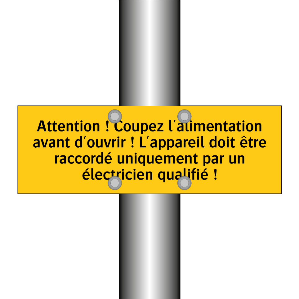 Panneau d'avertissement avec le texte : "Attention ! Coupez l'alimentation avant d'ouvrir ! L'appareil doit être raccordé uniquement par un électricien qualifié !"