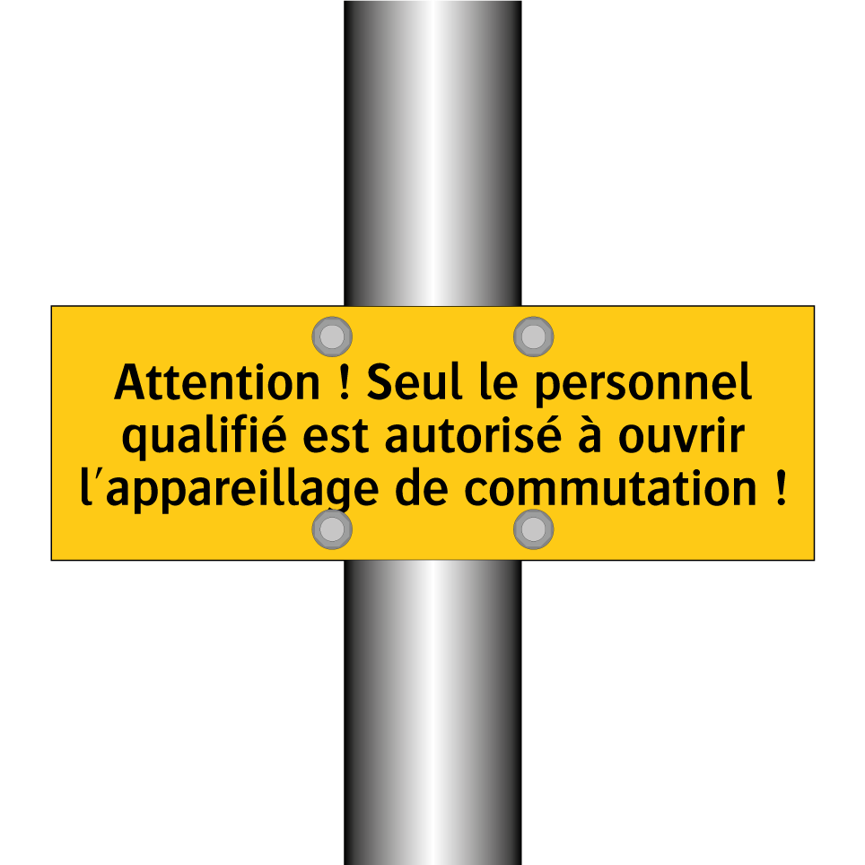 Panneau d'avertissement avec le texte : "Attention ! Seul le personnel qualifié est autorisé à ouvrir l'appareillage de commutation !"