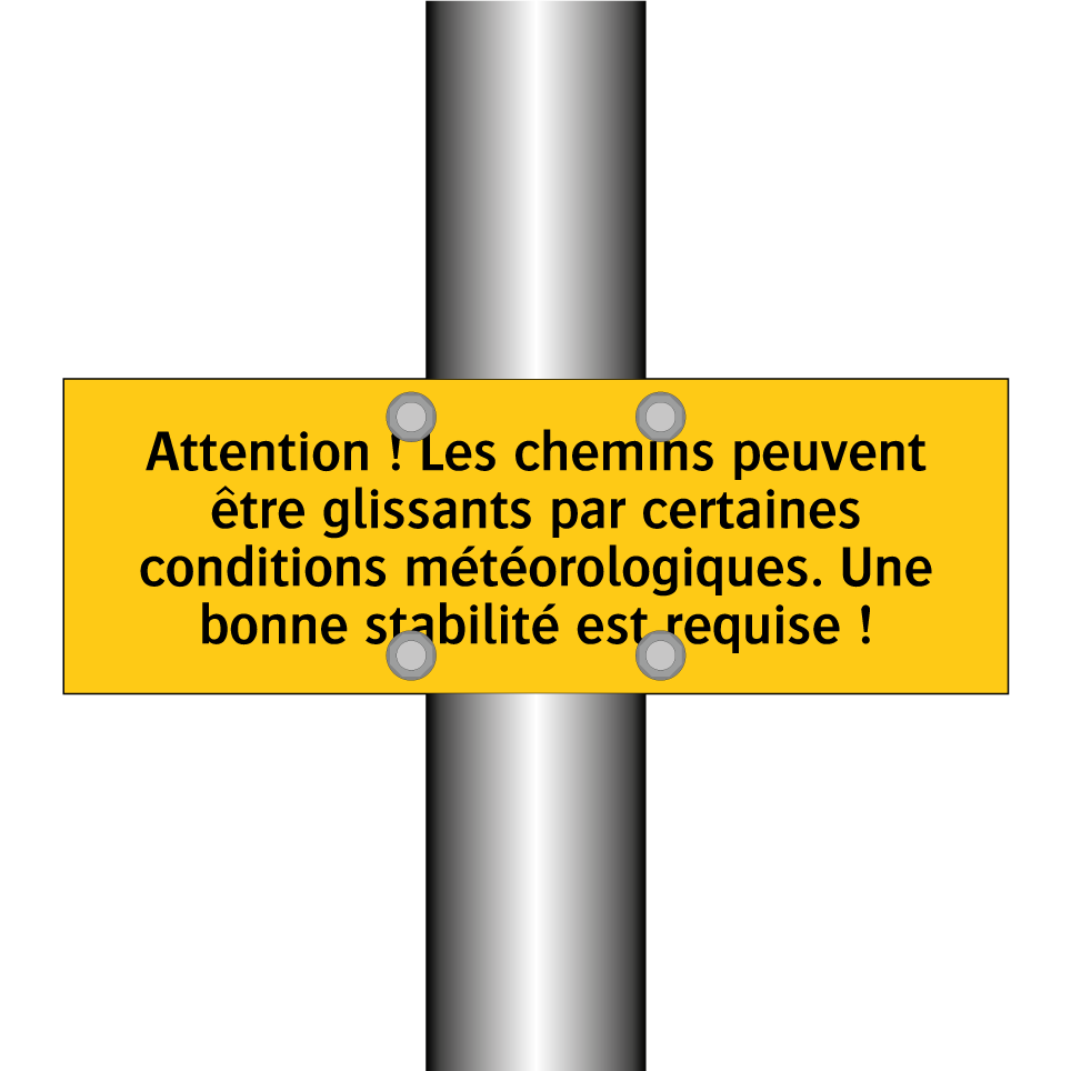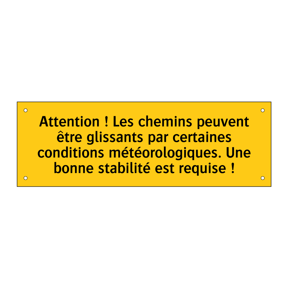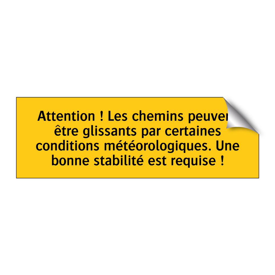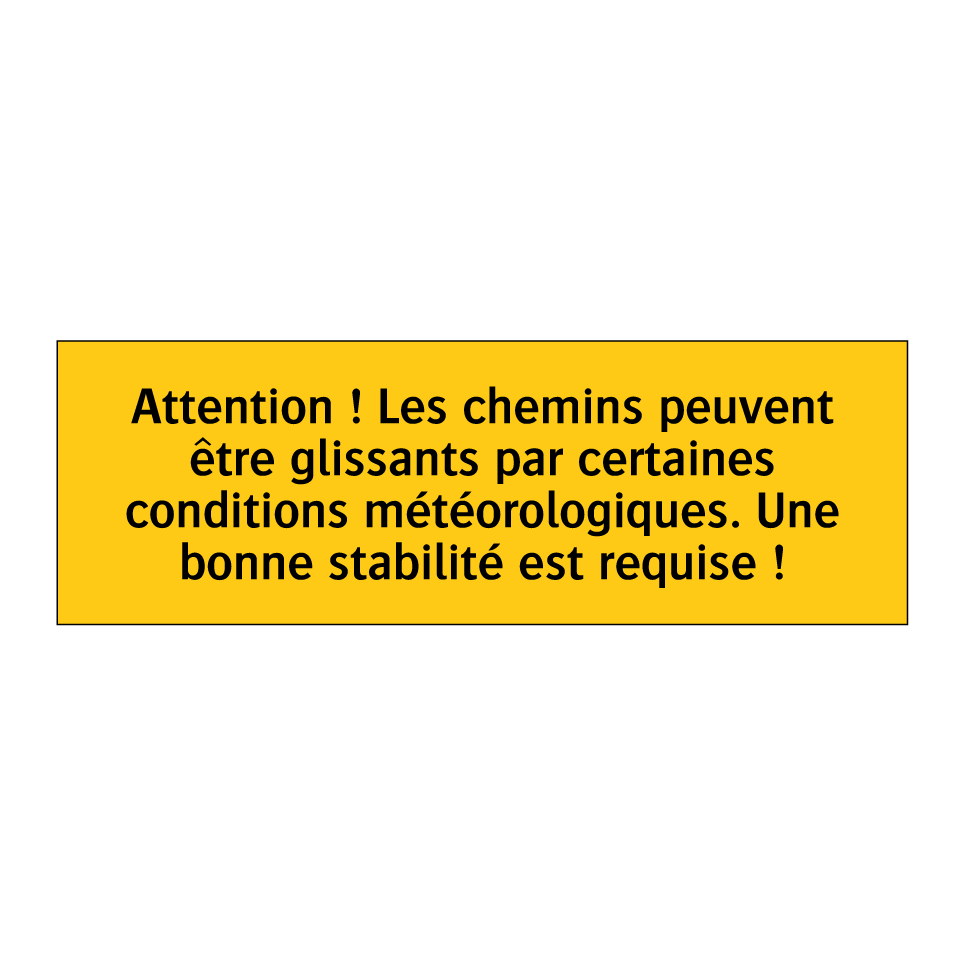 Panneau d'avertissement avec le texte : "Attention ! Les chemins peuvent être glissants par certaines conditions météorologiques. Une bonne stabilité est requise !"