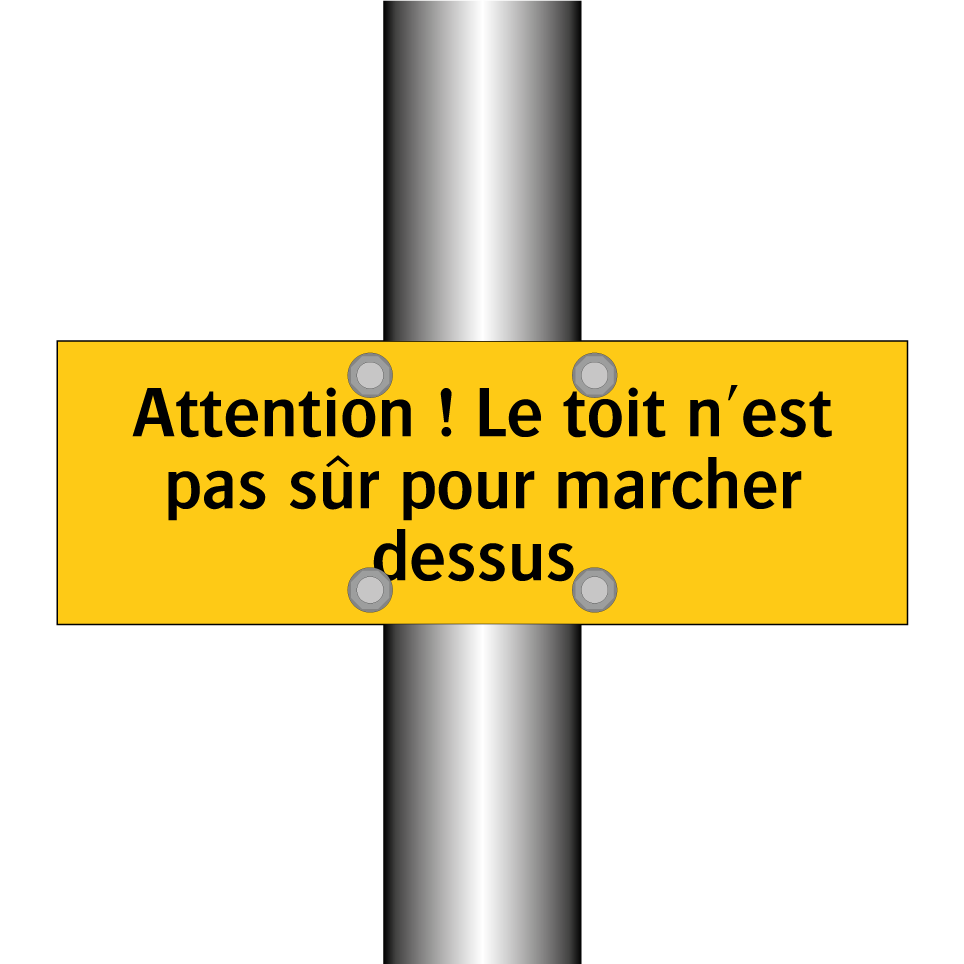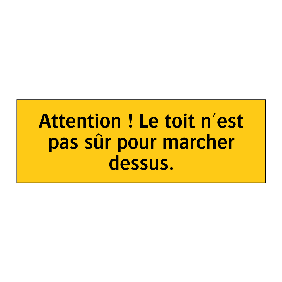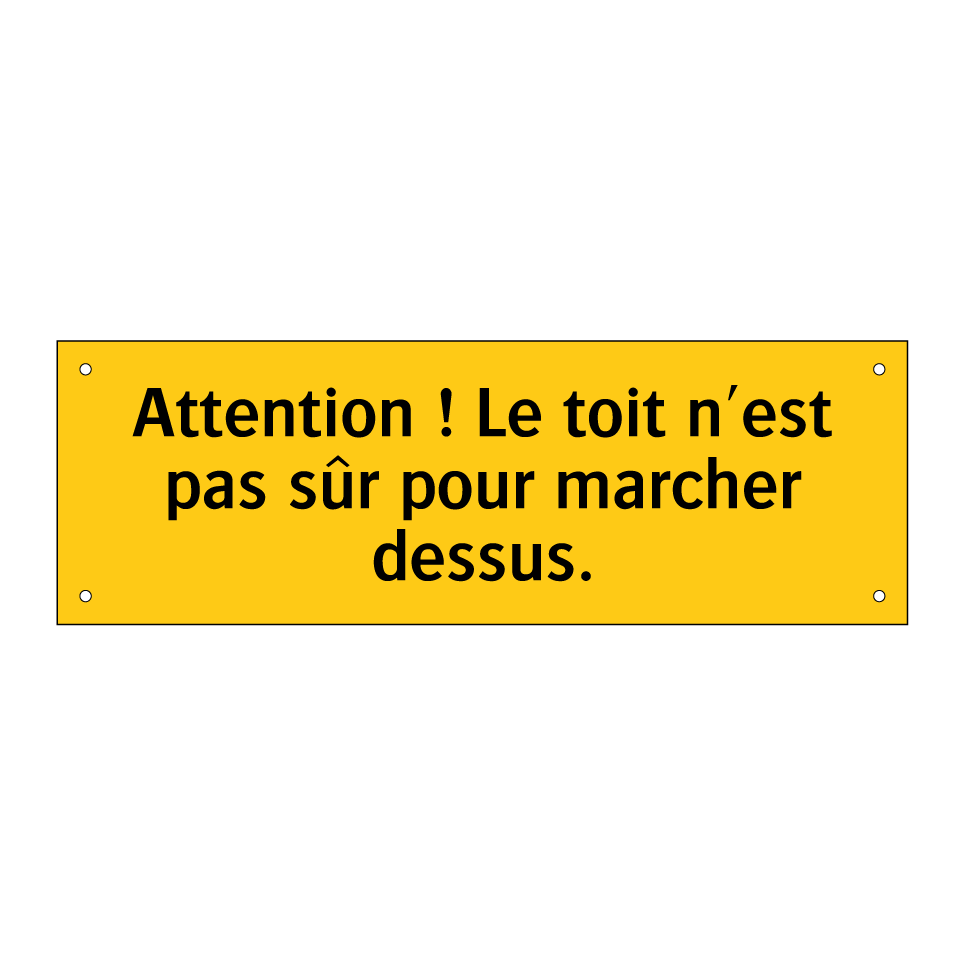 Panneau d'avertissement avec le texte : "Attention ! Le toit n'est pas sûr pour marcher dessus"