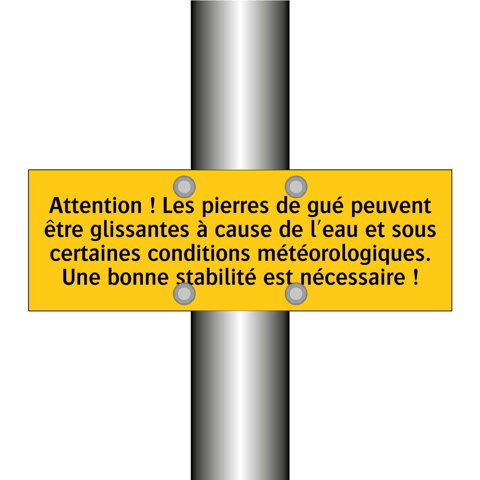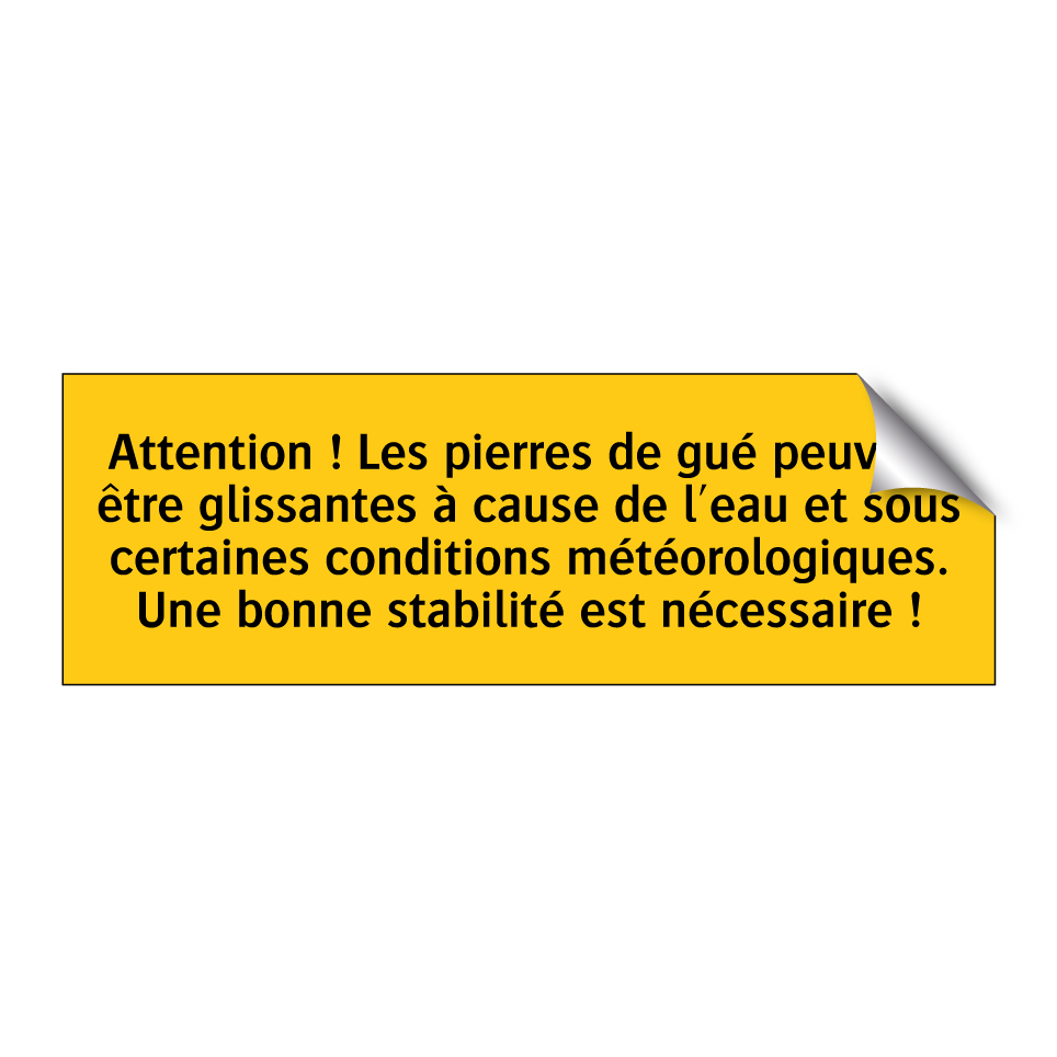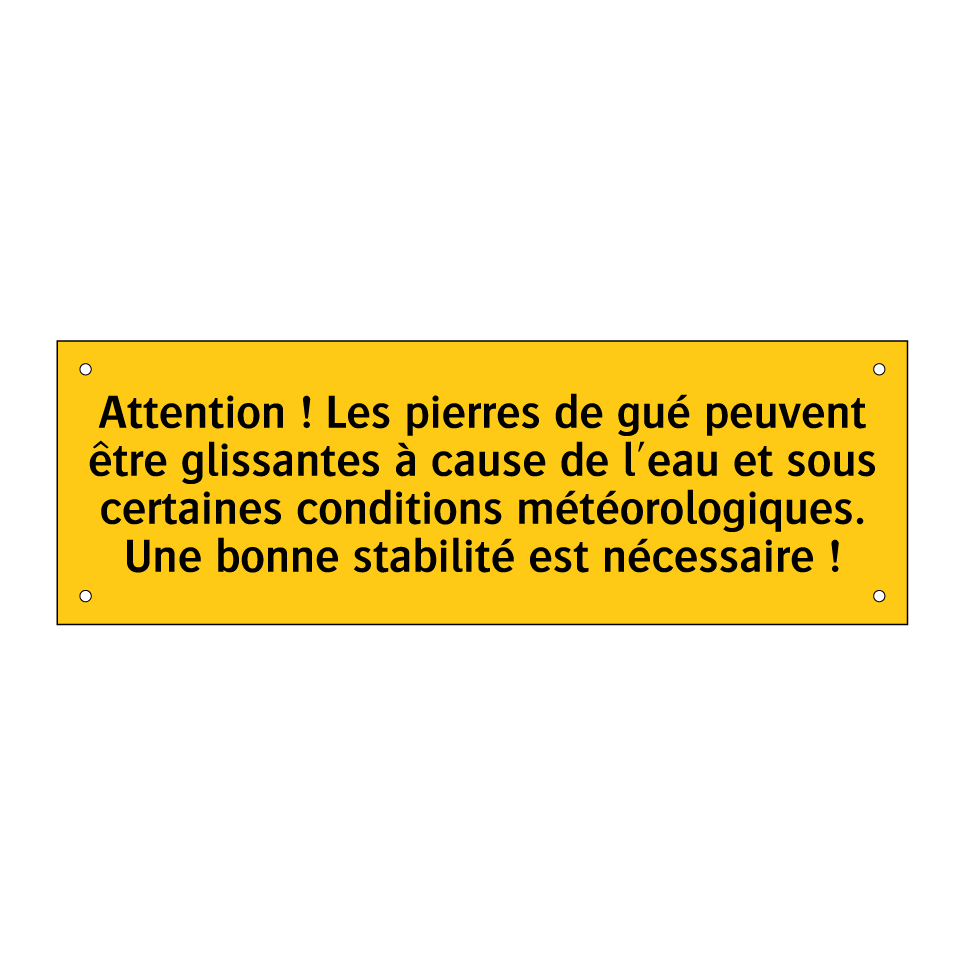 Panneau d'avertissement avec le texte : "Attention ! Les pierres de gué peuvent être glissantes à cause de l'eau et sous certaines conditions météorologiques. Une bonne stabilité est nécessaire !"
