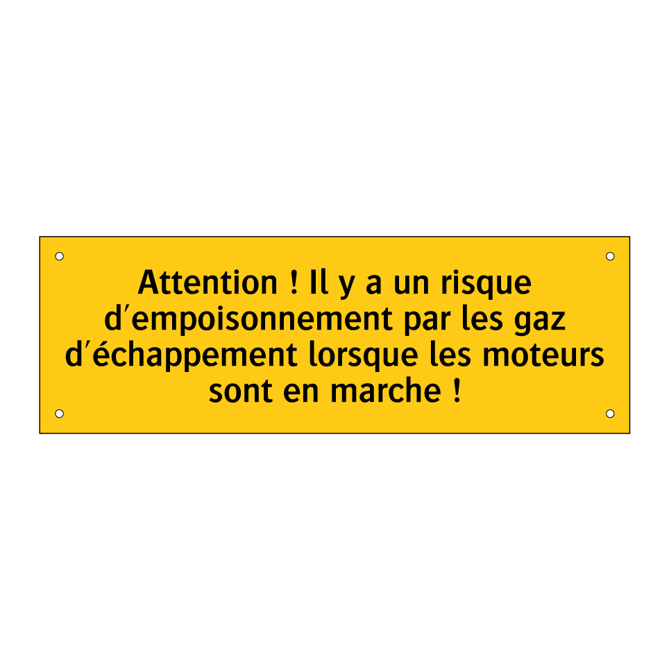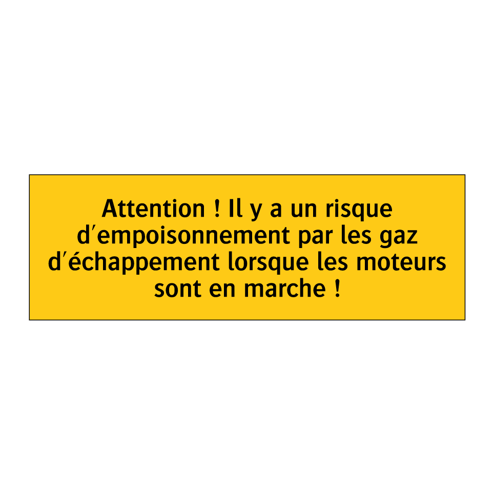 Panneau d'avertissement avec le texte : "Attention ! Il y a un risque d'empoisonnement par les gaz d'échappement lorsque les moteurs sont en marche !"