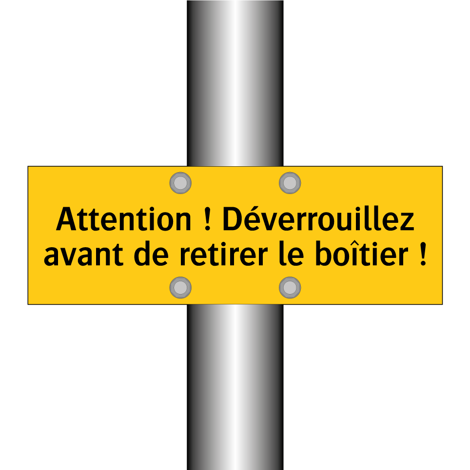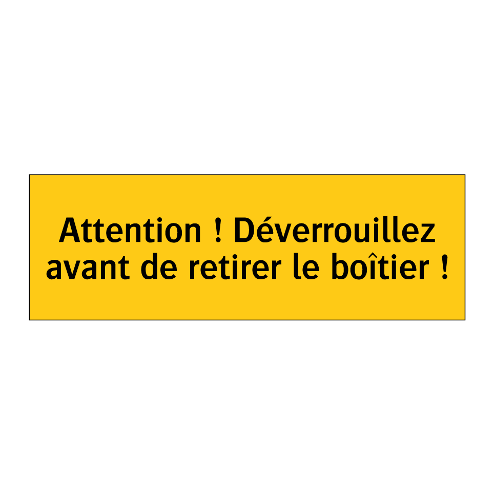 Panneau d'avertissement avec le texte : "Attention ! Déverrouillez avant de retirer le boîtier !"