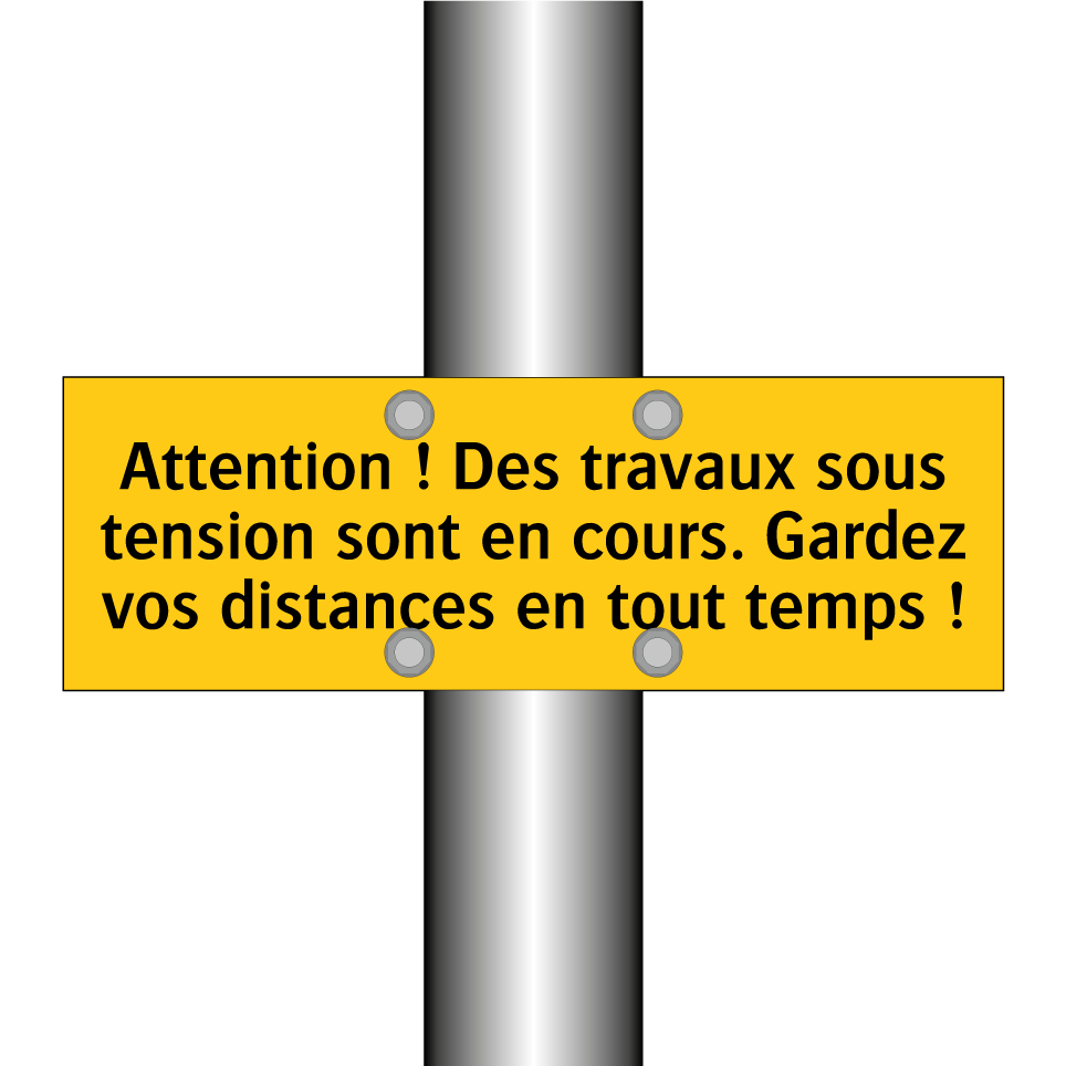 Panneau d'avertissement avec le texte : "Attention ! Des travaux sous tension sont en cours. Gardez vos distances en tout temps !"