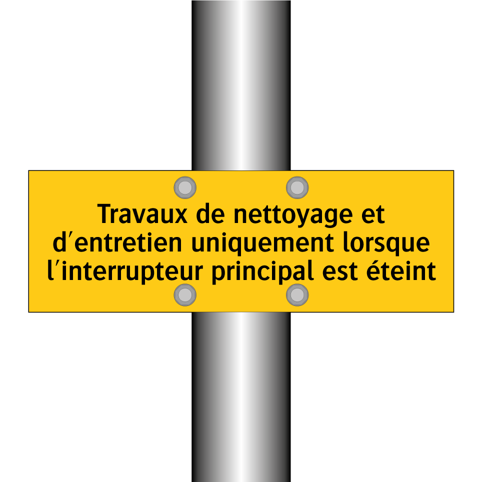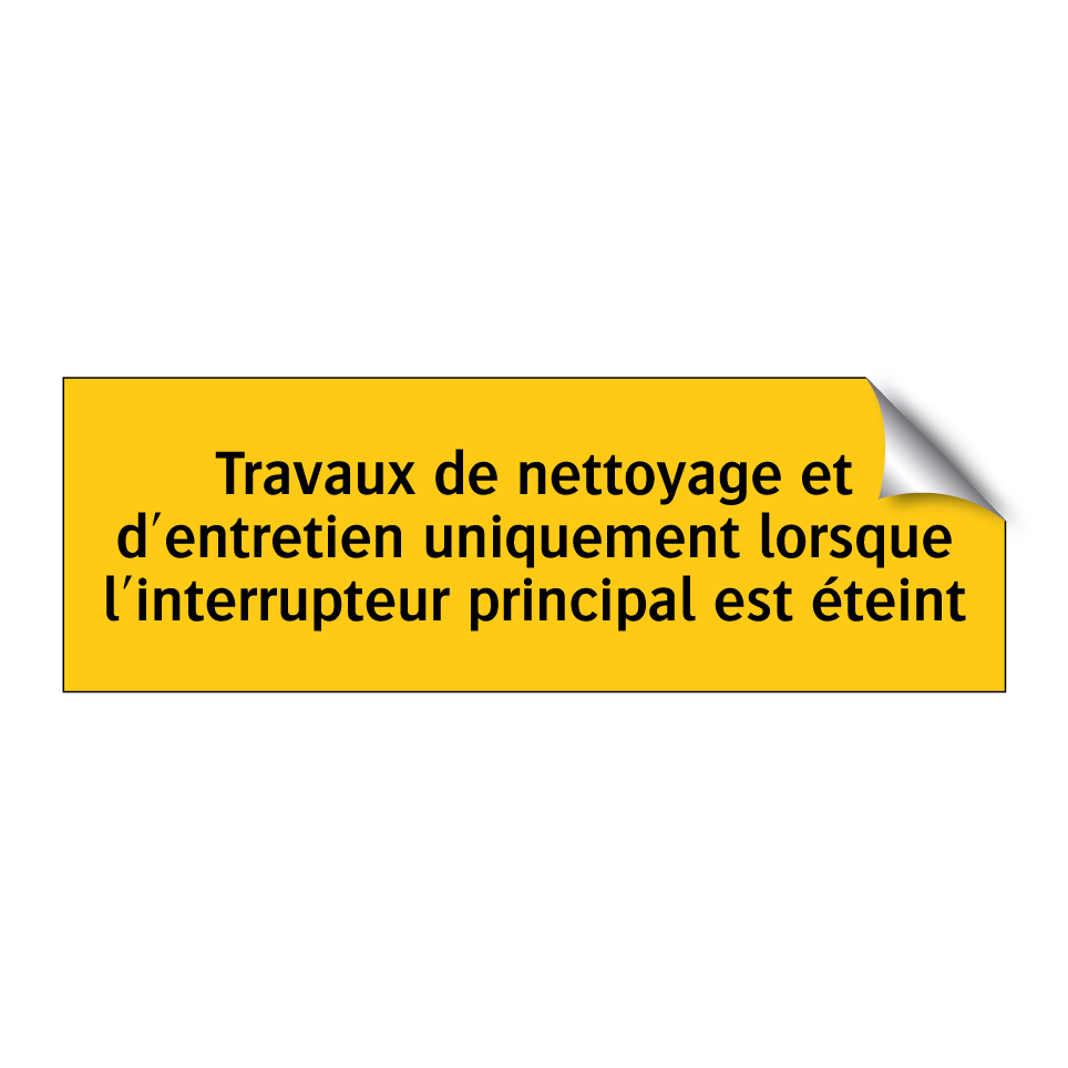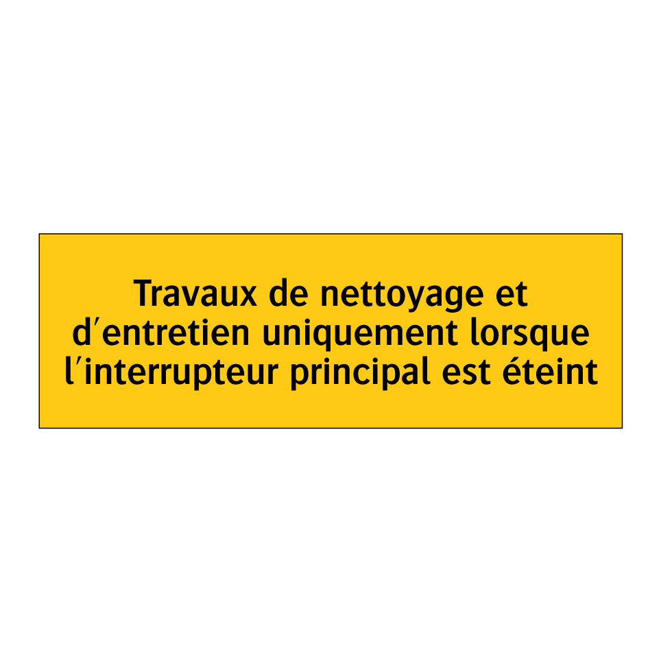 Panneau d'avertissement avec le texte : "Travaux de nettoyage et d'entretien uniquement lorsque l'interrupteur principal est éteint"