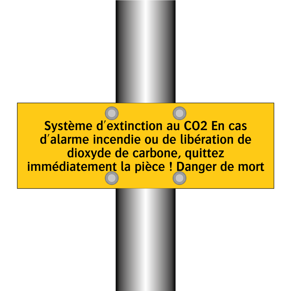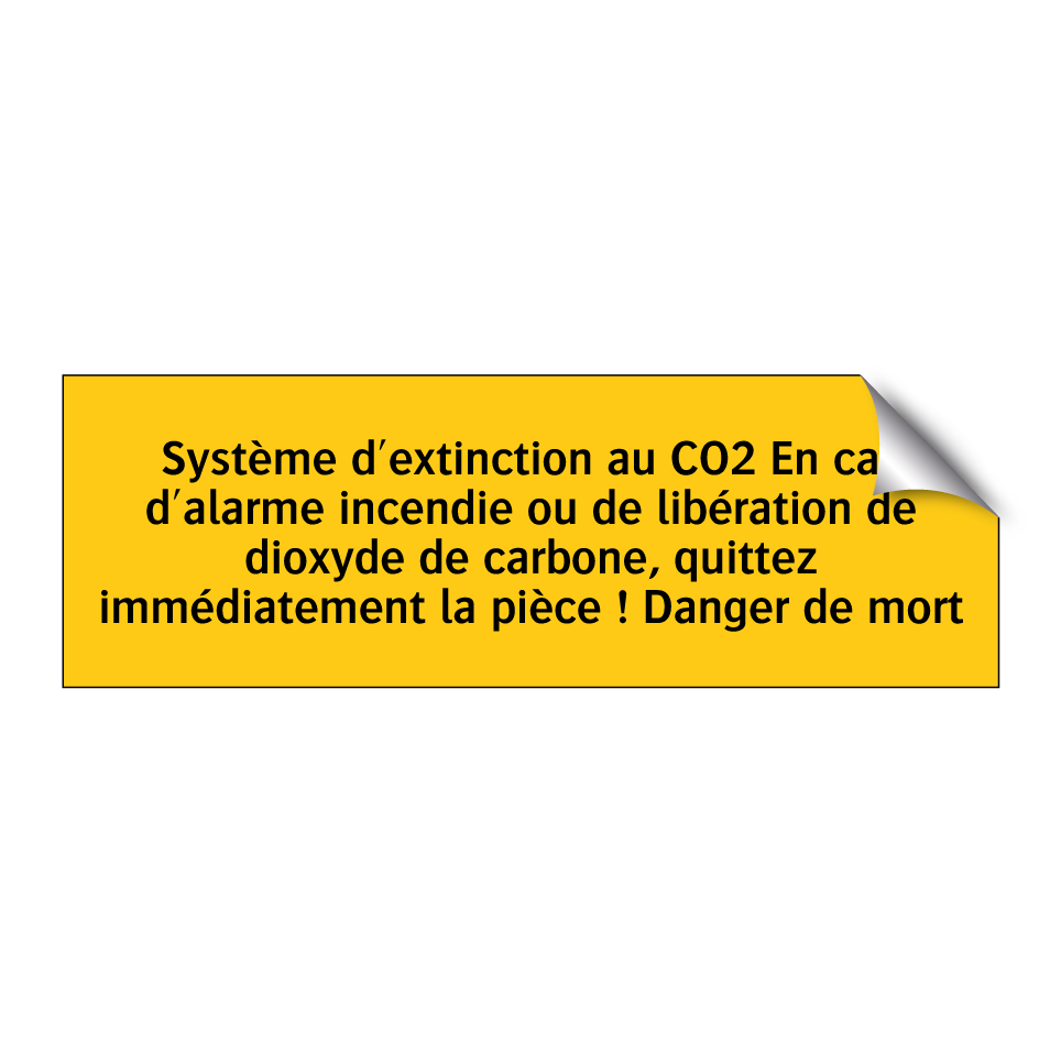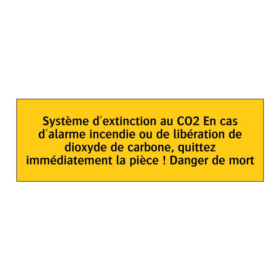 Panneau d'avertissement avec le texte : "Système d'extinction au CO2 En cas d'alarme incendie ou de libération de dioxyde de carbone, quittez immédiatement la pièce ! Danger de mort"