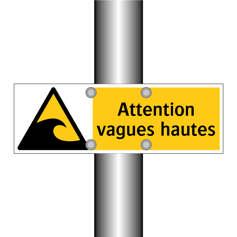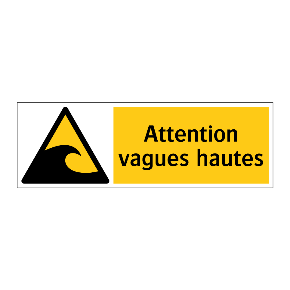 Panneau d'avertissement avec le texte : "Attention vagues hautes"