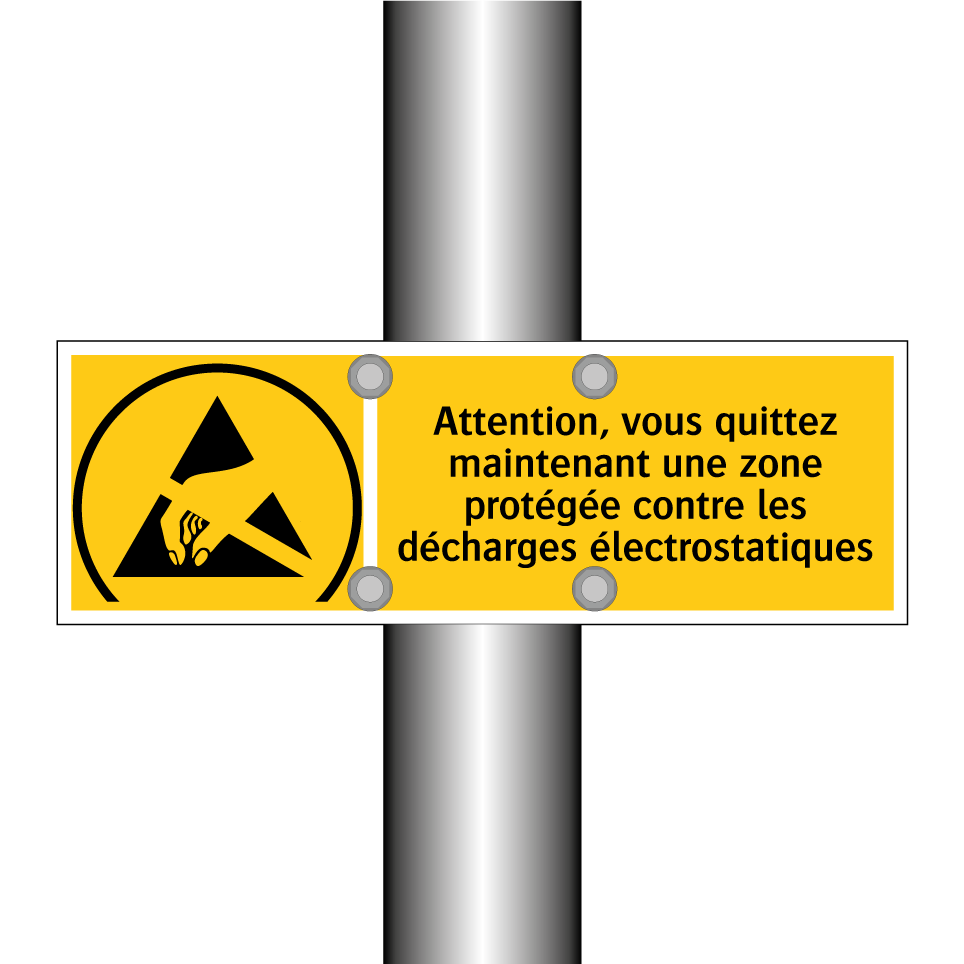 Panneau d'avertissement avec le texte : "Attention, vous quittez maintenant une zone protégée contre les décharges électrostatiques"