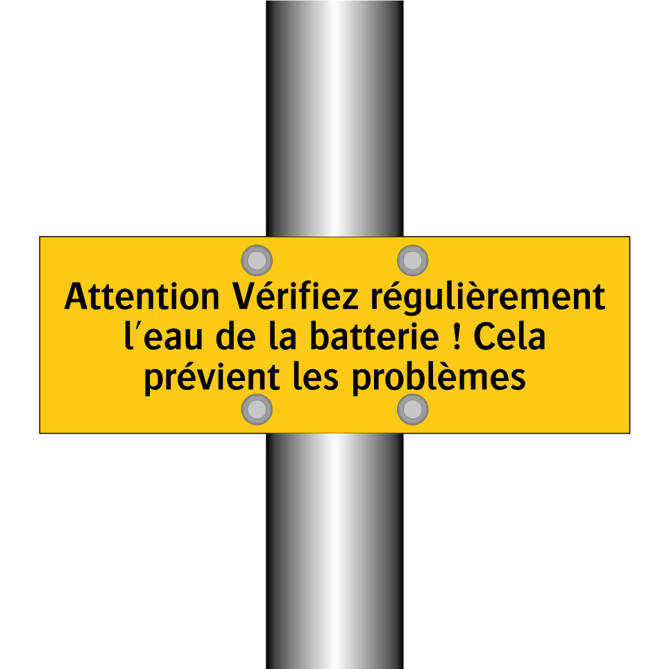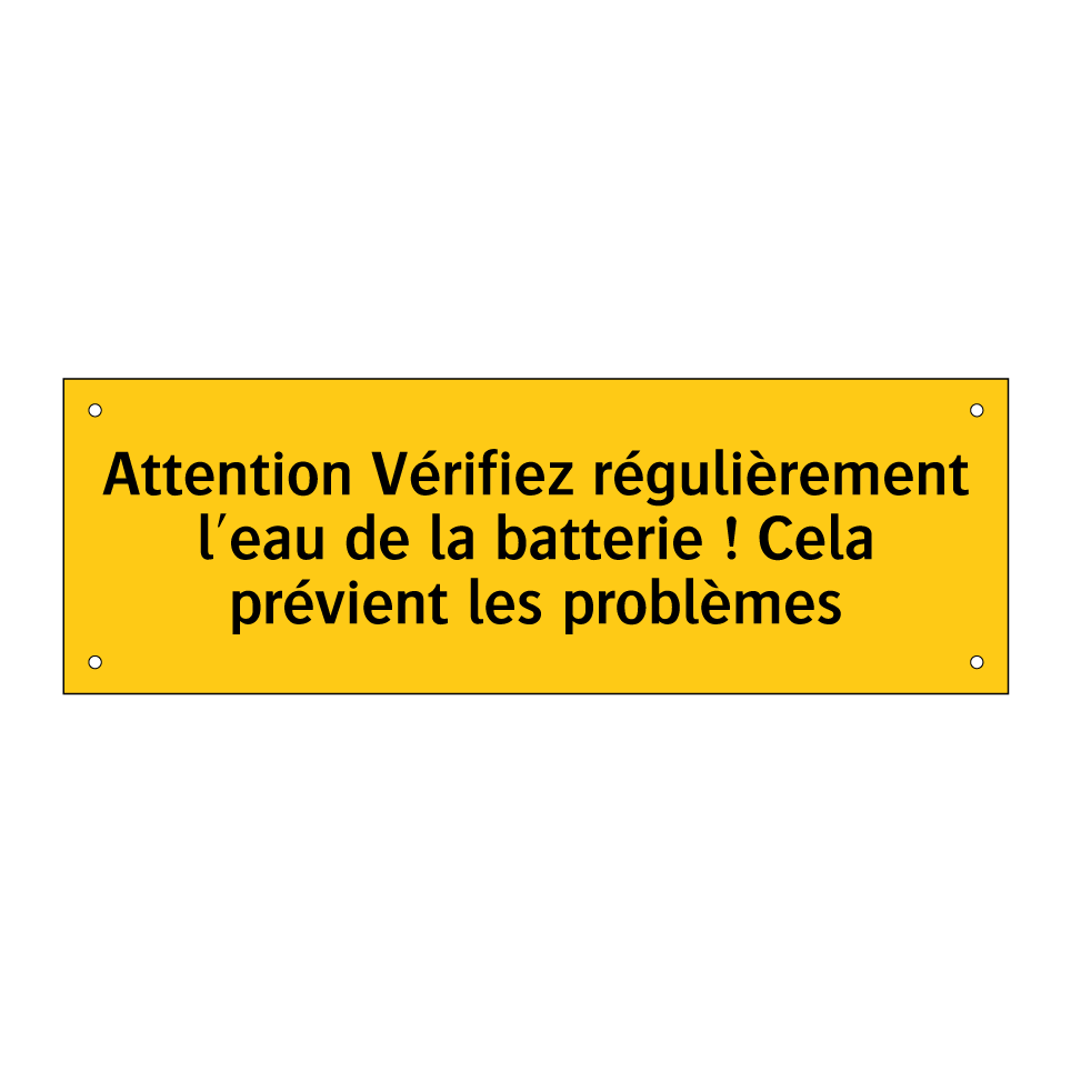 Panneau d'avertissement avec le texte : "Attention Vérifiez régulièrement l'eau de la batterie ! Cela prévient les problèmes"