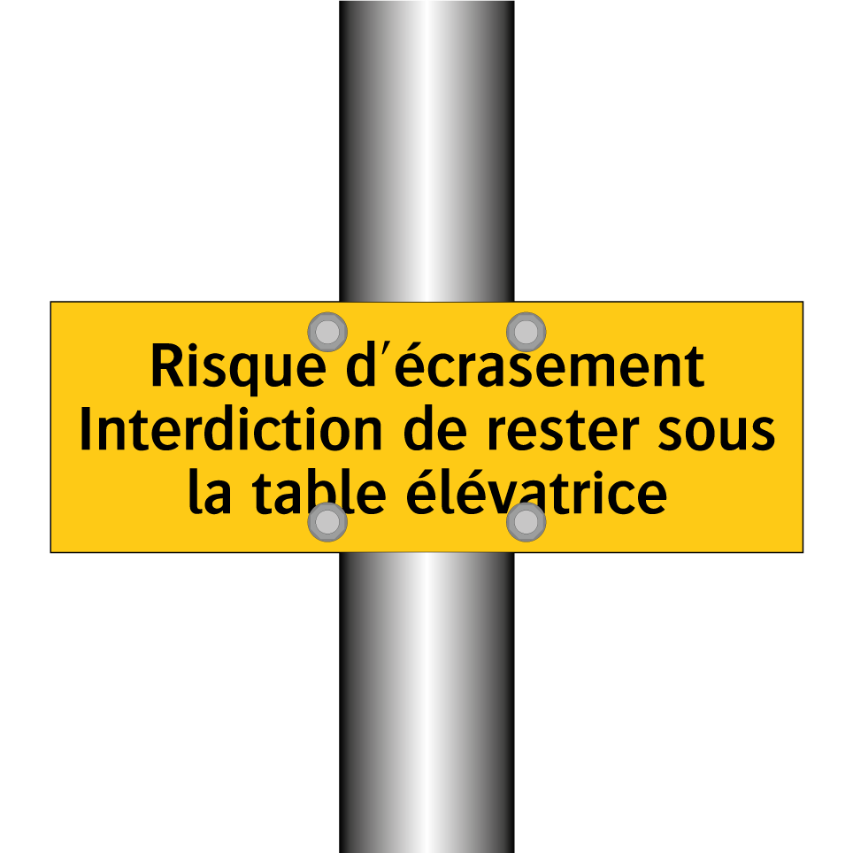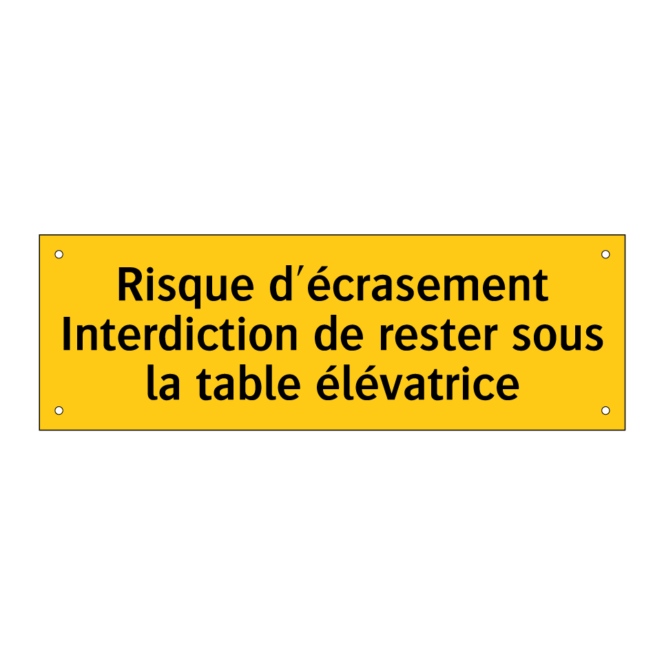 Panneau d'avertissement avec le texte : "Risque d'écrasement Interdiction de rester sous la table élévatrice"