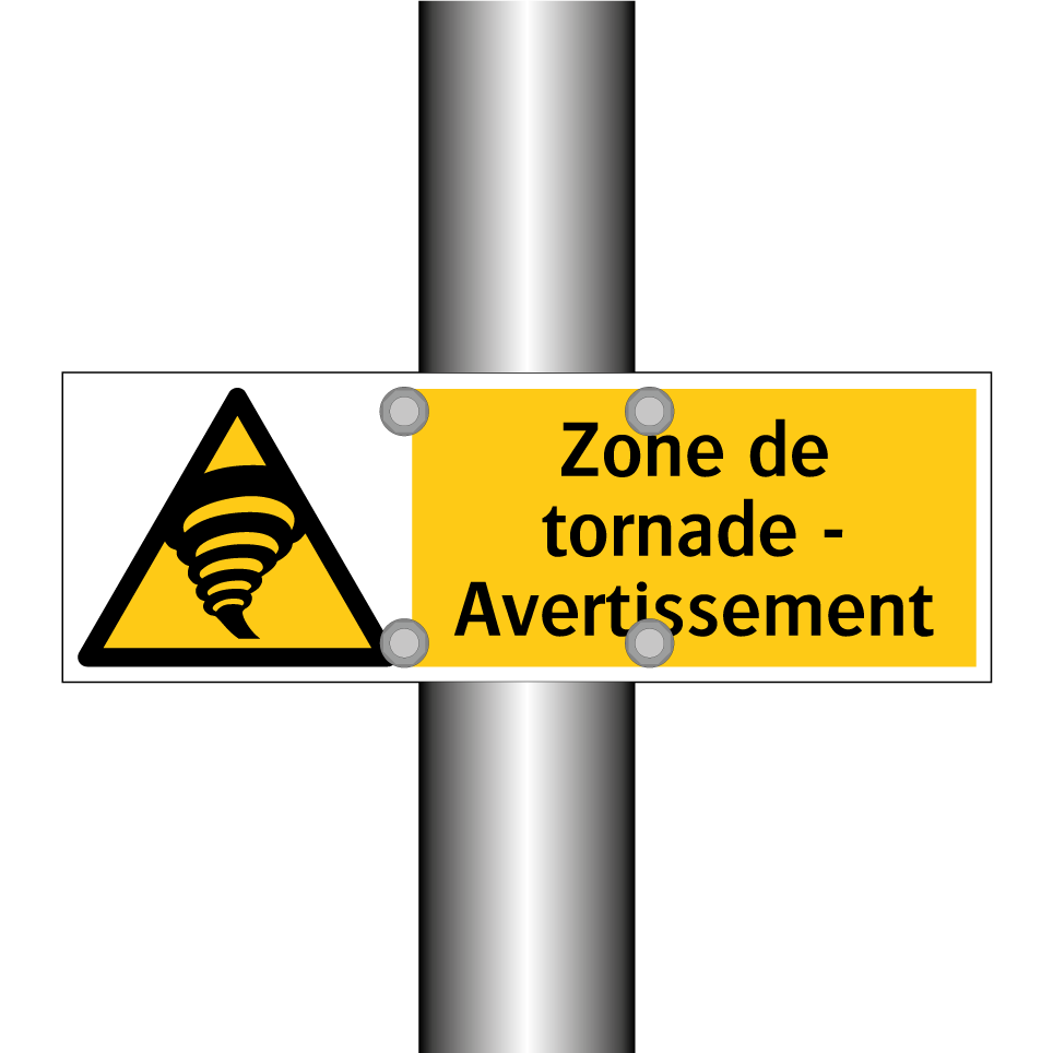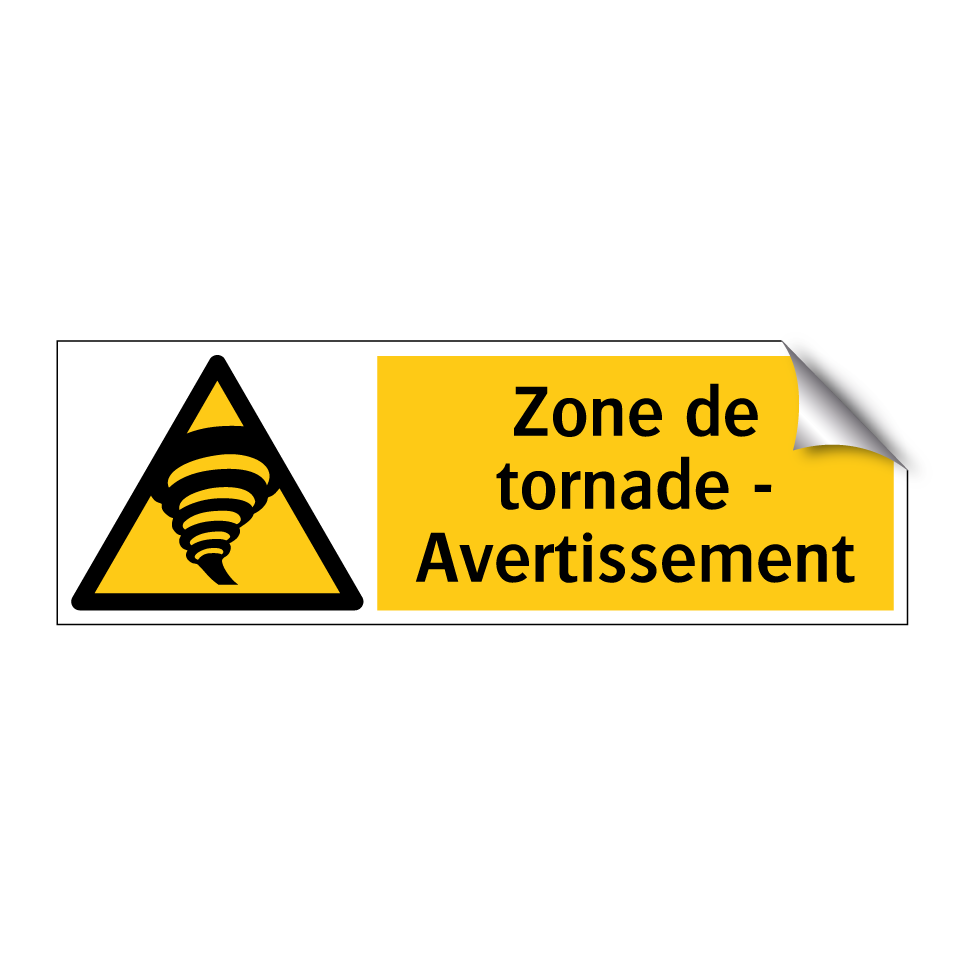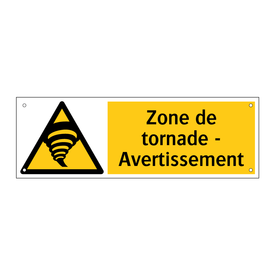Panneau d'avertissement avec le texte : "Zone de tornade - Avertissement"